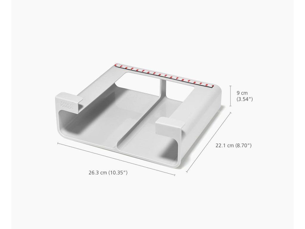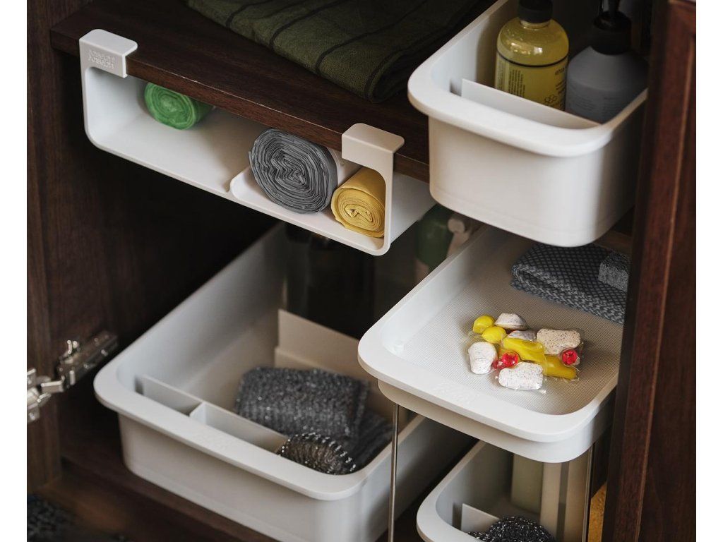 Organizér JOSEPH JOSEPH CupboardStore 8500019 k umístění do nevyužitého prostoru pod poličkou kuchyňské skříňky. K ukládání rolí a krabic kuchyňských fólií, alobalu, pečícího papíru, sáčků. Snadná instalace pomocí samolepící 3M pásky. Určena pro skříňky s vnitřní hloubkou alespoň 26 cm / max. tloušťka poličky 2 cm.