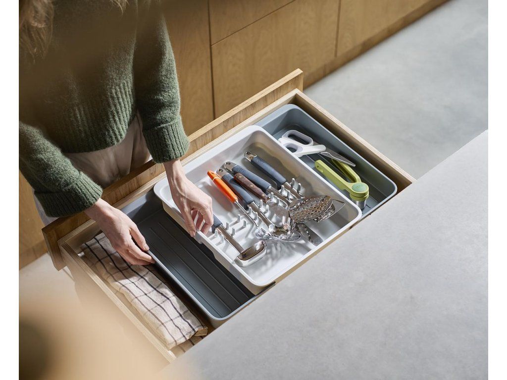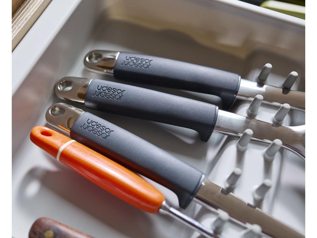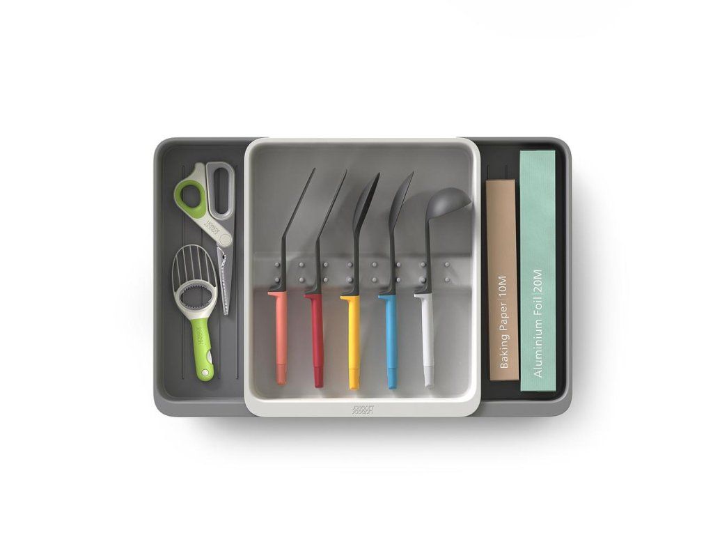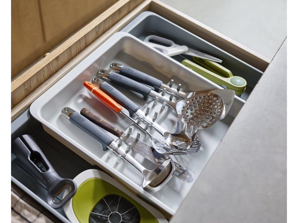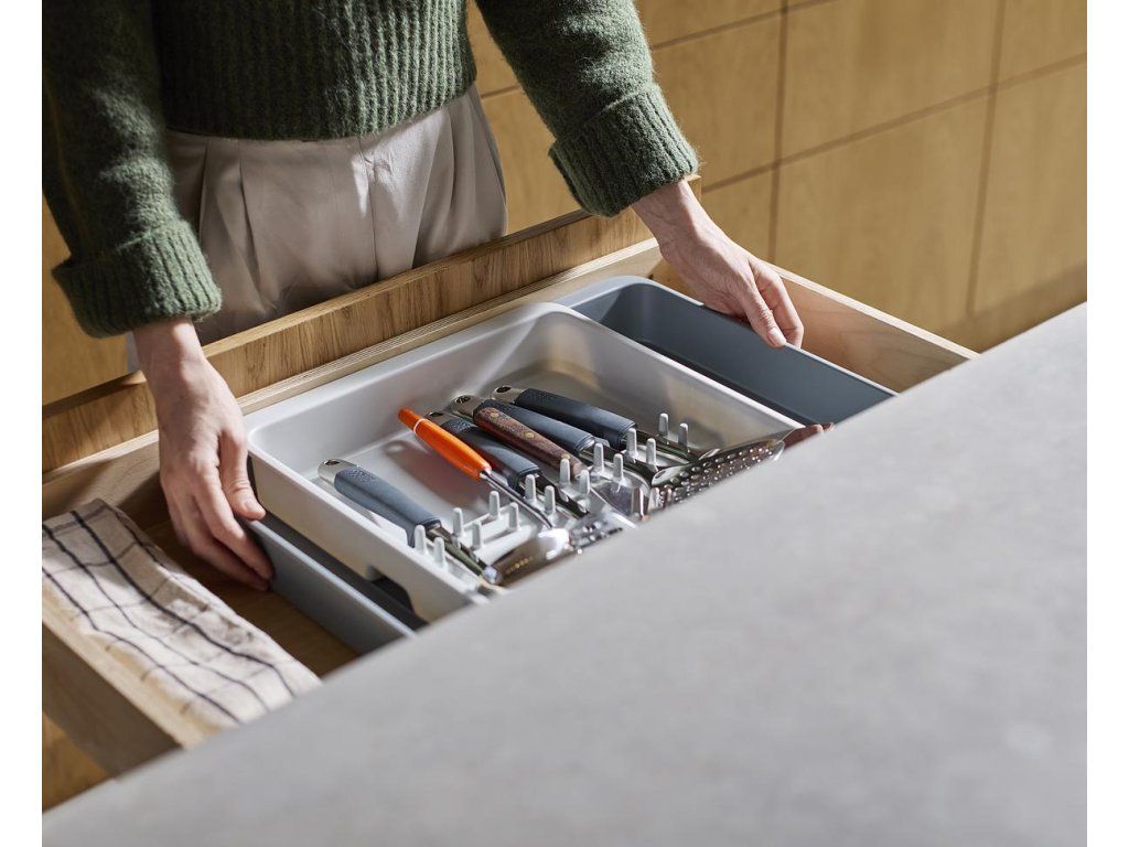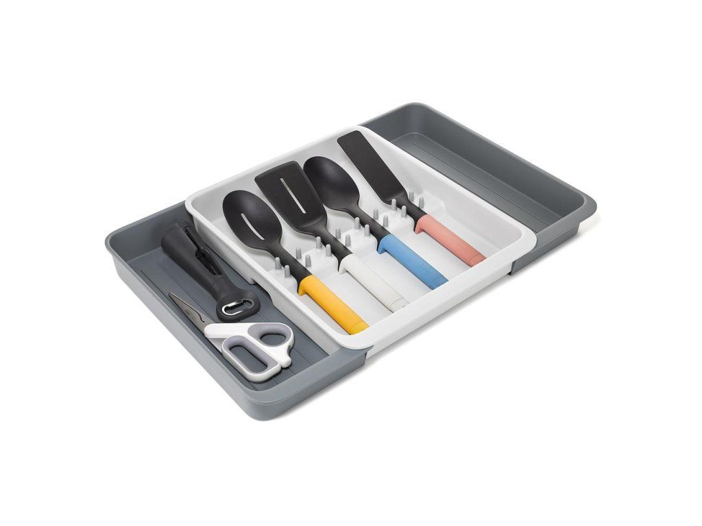 Roztažitelný organizér na kuchyňské náčiní JOSEPH JOSEPH DrawerStore 8500017. Organizér má velkou přihrádku a rozkládací boky k uložení velkých kuchyňských nástrojů i drobného náčiní. Vhodné pro zásuvky s minimální výškou 7,5 cm.