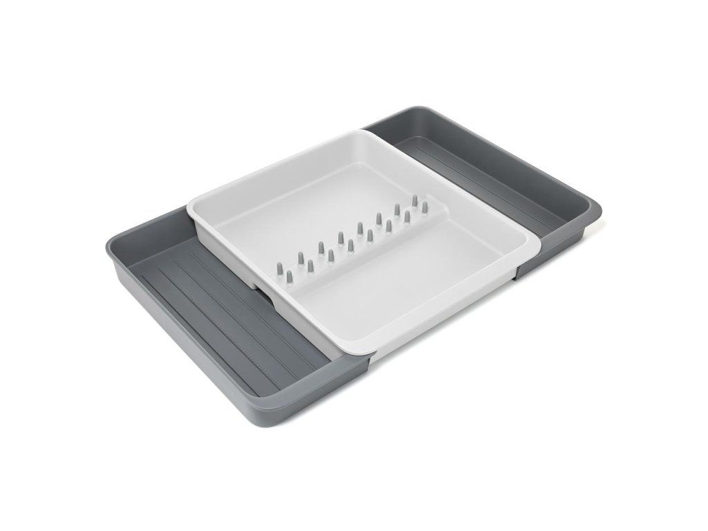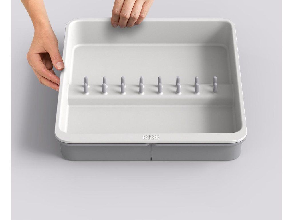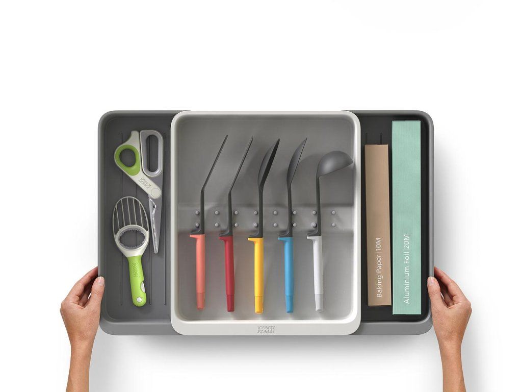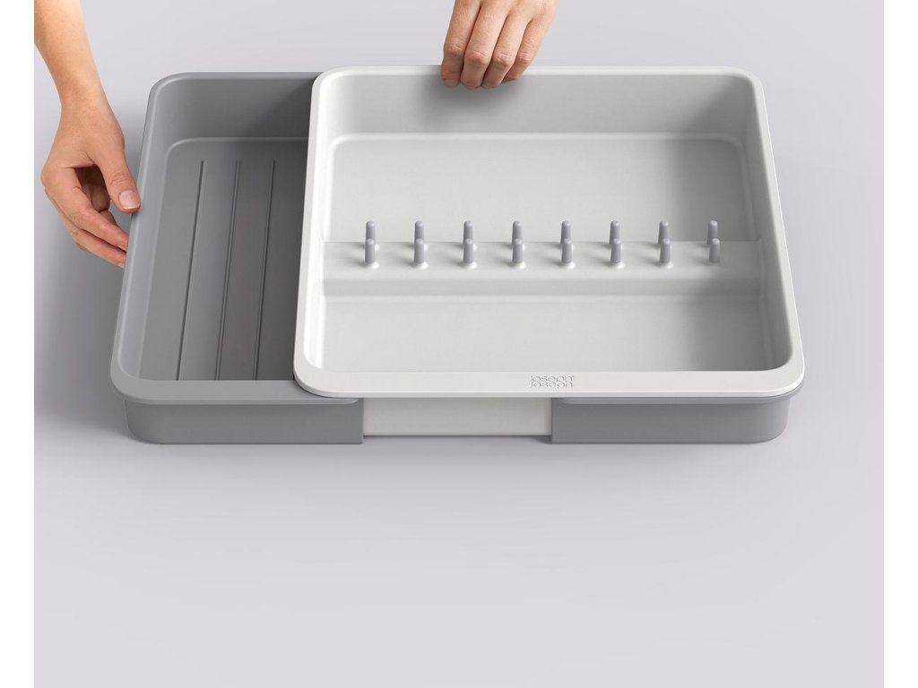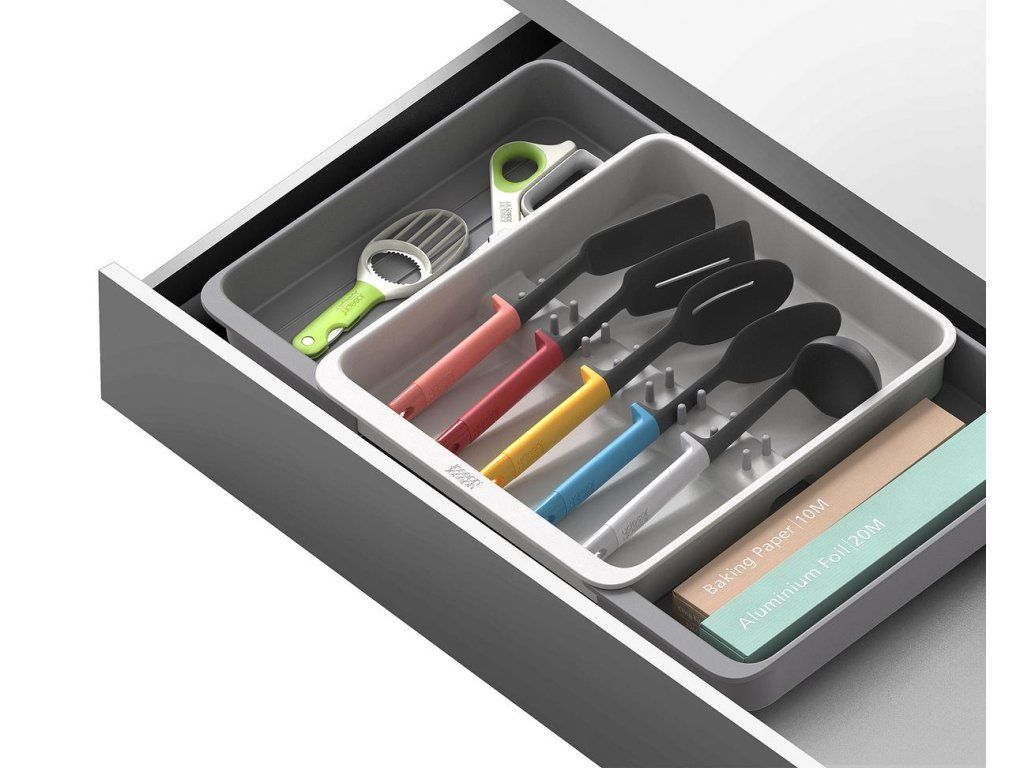 Roztažitelný organizér na kuchyňské náčiní JOSEPH JOSEPH DrawerStore 8500017. Organizér má velkou přihrádku a rozkládací boky k uložení velkých kuchyňských nástrojů i drobného náčiní. Vhodné pro zásuvky s minimální výškou 7,5 cm.