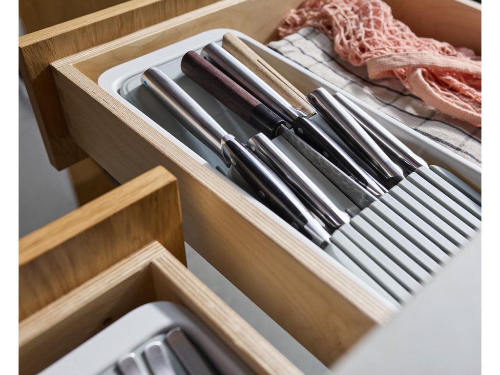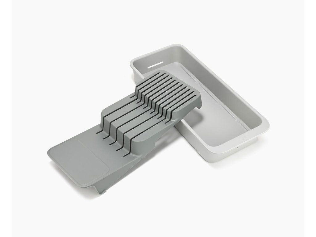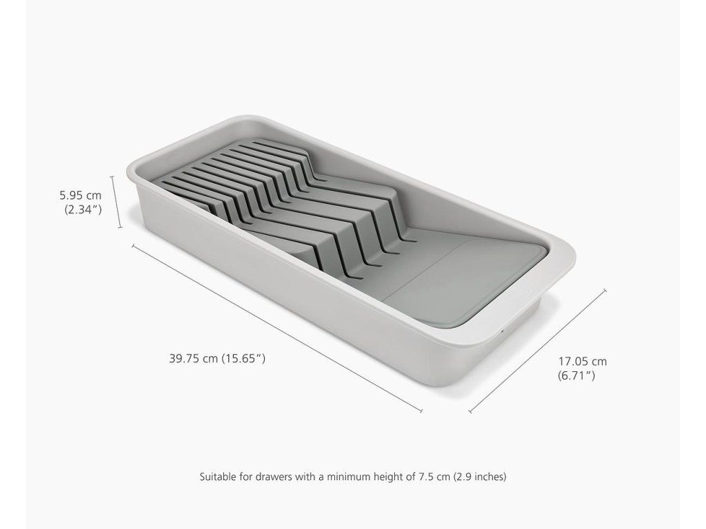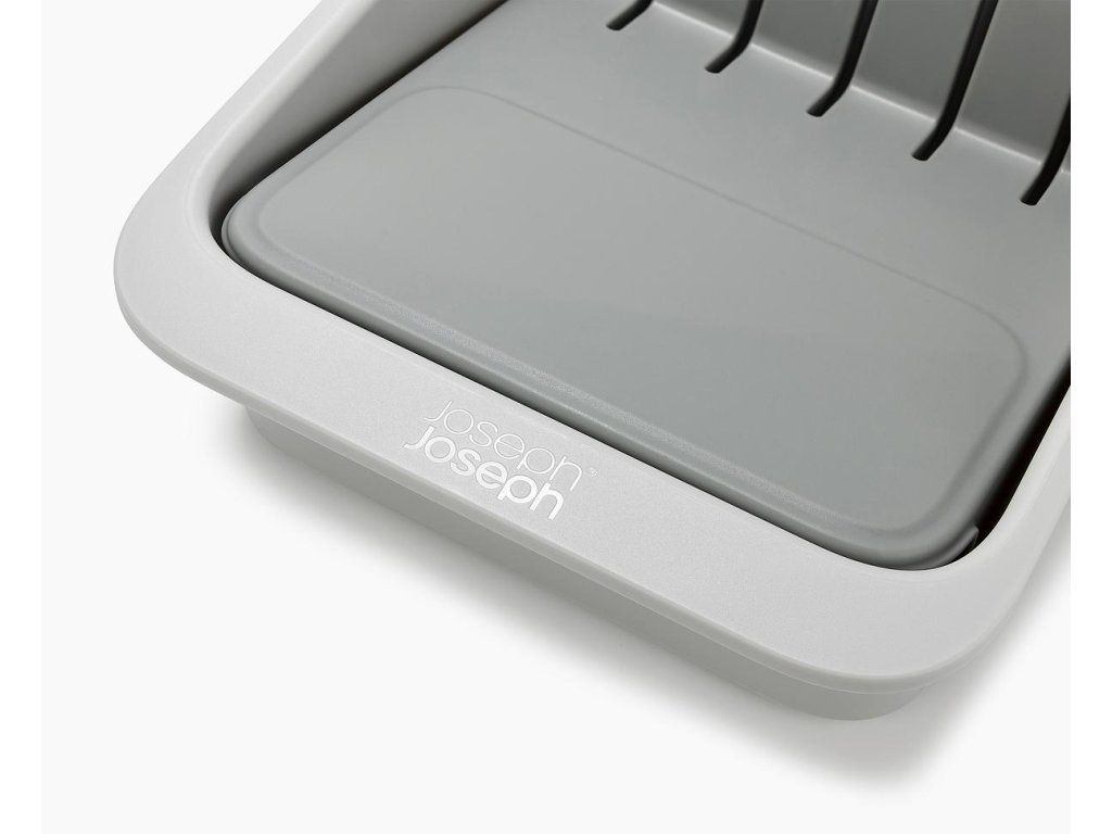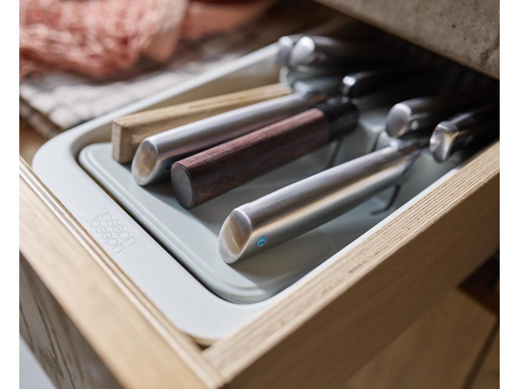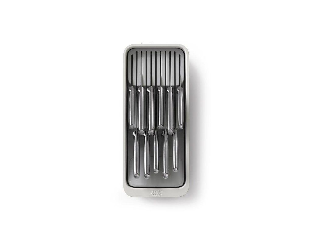 Kompaktní, stupňovitý organizér na nože JOSEPH JOSEPH DrawerStore 8500013. K bezpečnému uložení až 11 nožů - malých i velkých. Organizér udržuje čepele v bezpečí a zároveň uvolňuje místo v zásuvce. Vhodný pro zásuvky s minimální výškou 9,5 cm.