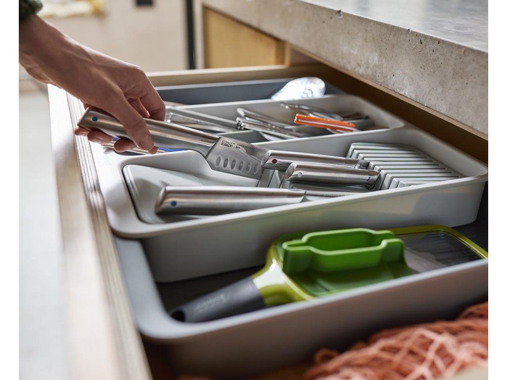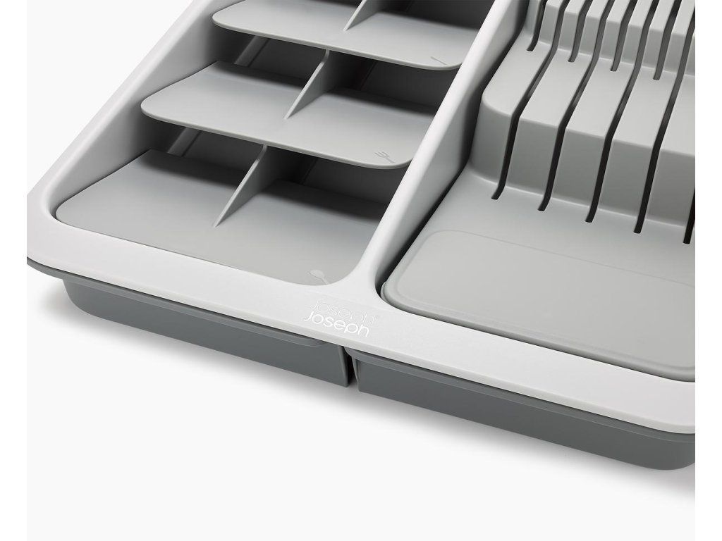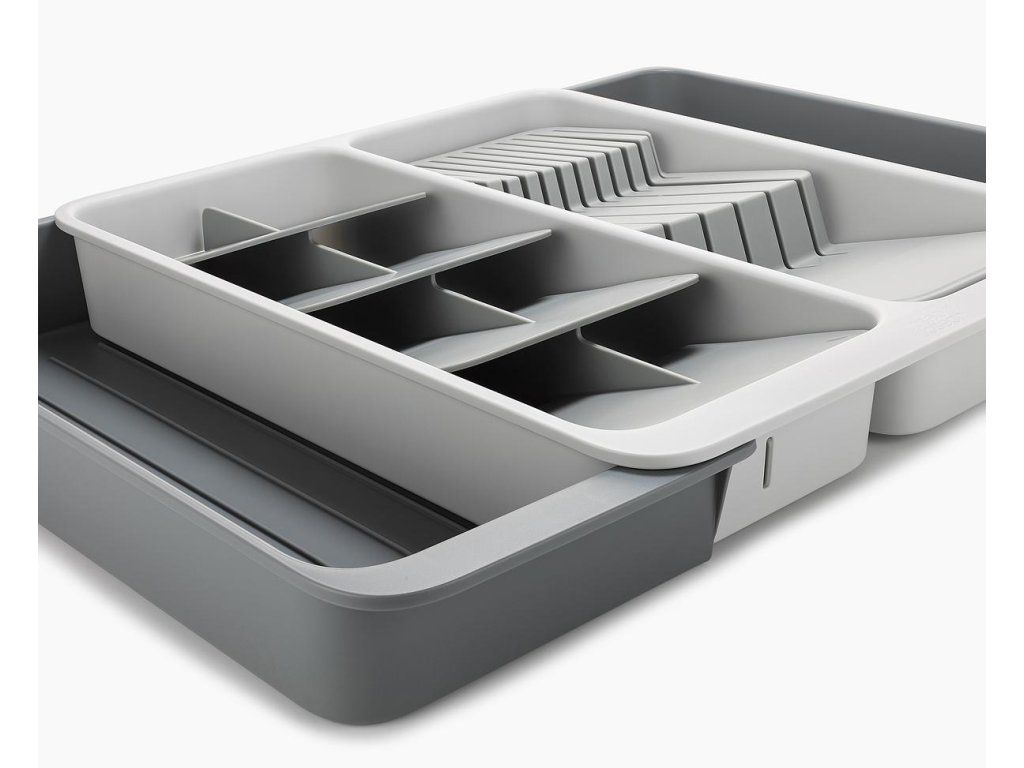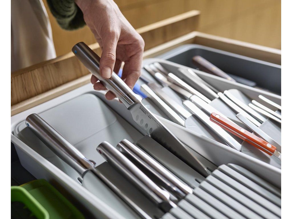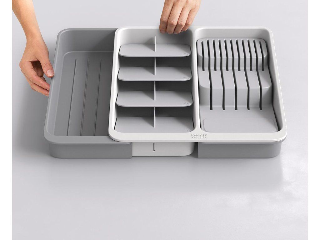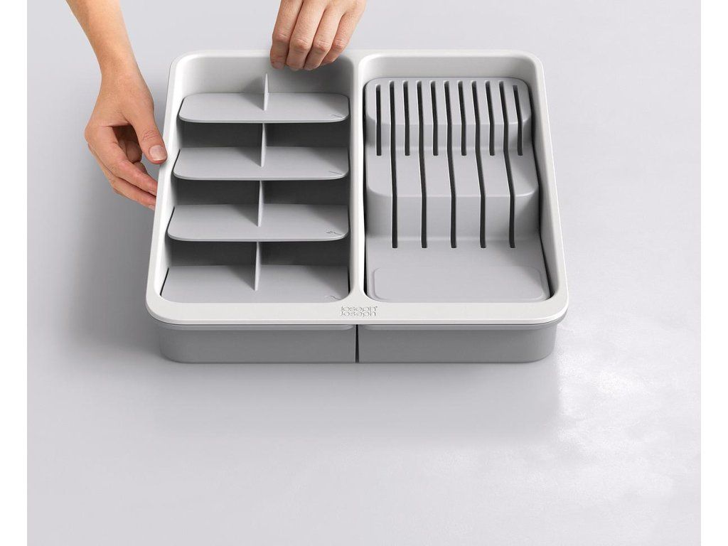 Roztažitelný organizér na příbory a kuchyňské náčiní JOSEPH JOSEPH DrawerStore 8500015. Příbory ukládány do slotů označených ikonami. Až 11 nožů – malých i velkých - k uložení do stupňovitého organizéru. Hluboké přihrádky na drobnosti a roztažitelné bočnice na kuchyňské náčiní. Vhodné pro zásuvky s minimální výškou 9 cm.