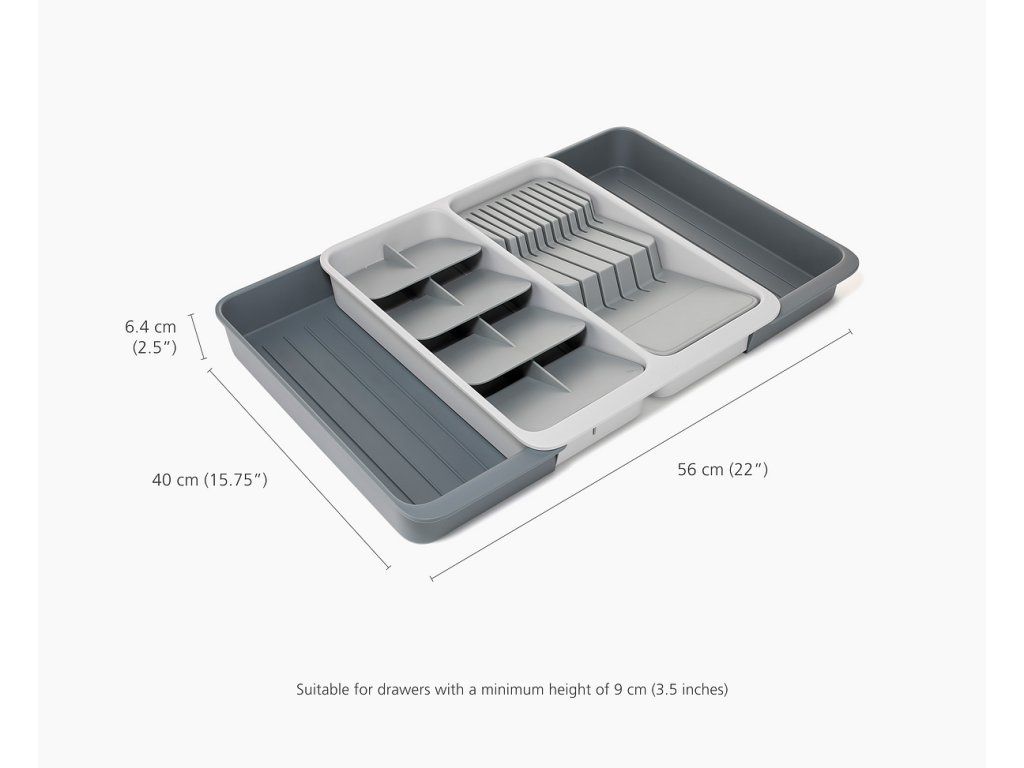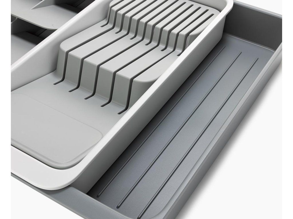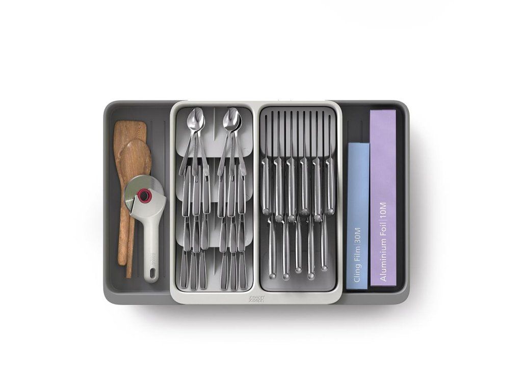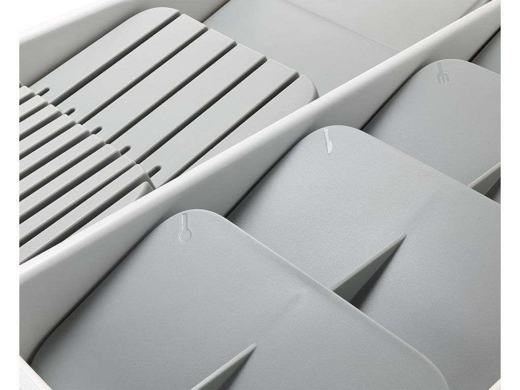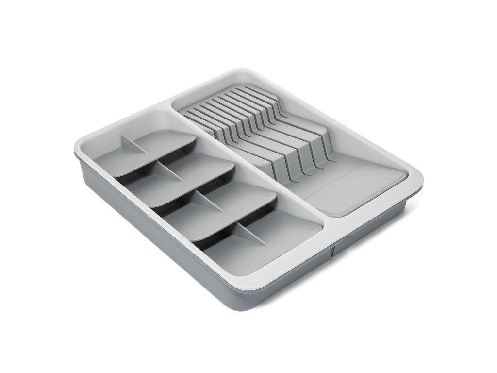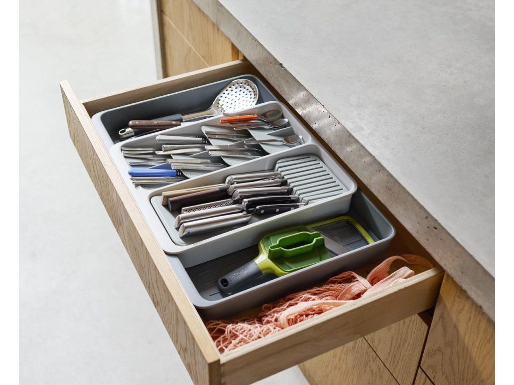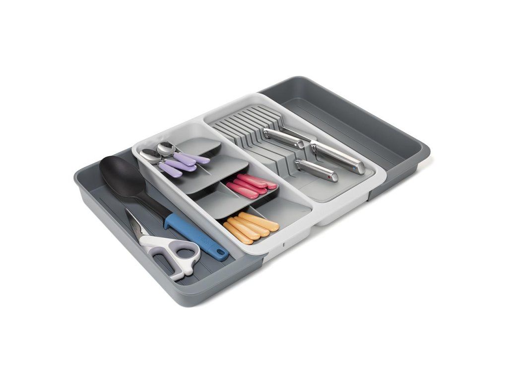 Roztažitelný organizér na příbory a kuchyňské náčiní JOSEPH JOSEPH DrawerStore 8500015. Příbory ukládány do slotů označených ikonami. Až 11 nožů – malých i velkých - k uložení do stupňovitého organizéru. Hluboké přihrádky na drobnosti a roztažitelné bočnice na kuchyňské náčiní. Vhodné pro zásuvky s minimální výškou 9 cm.