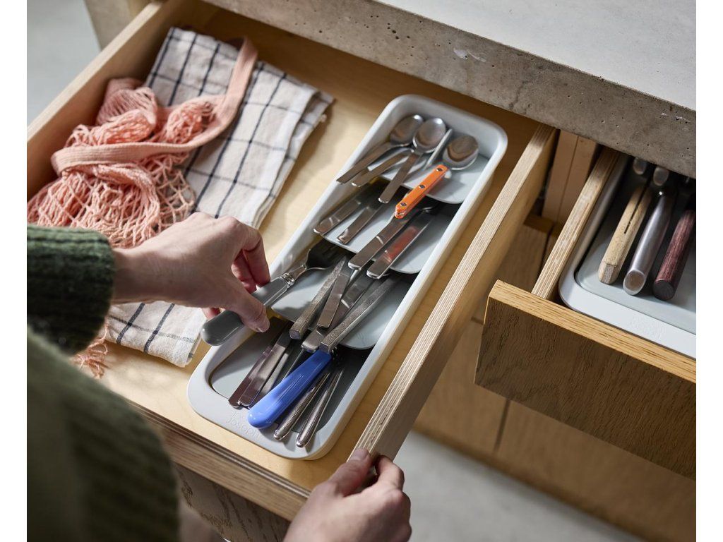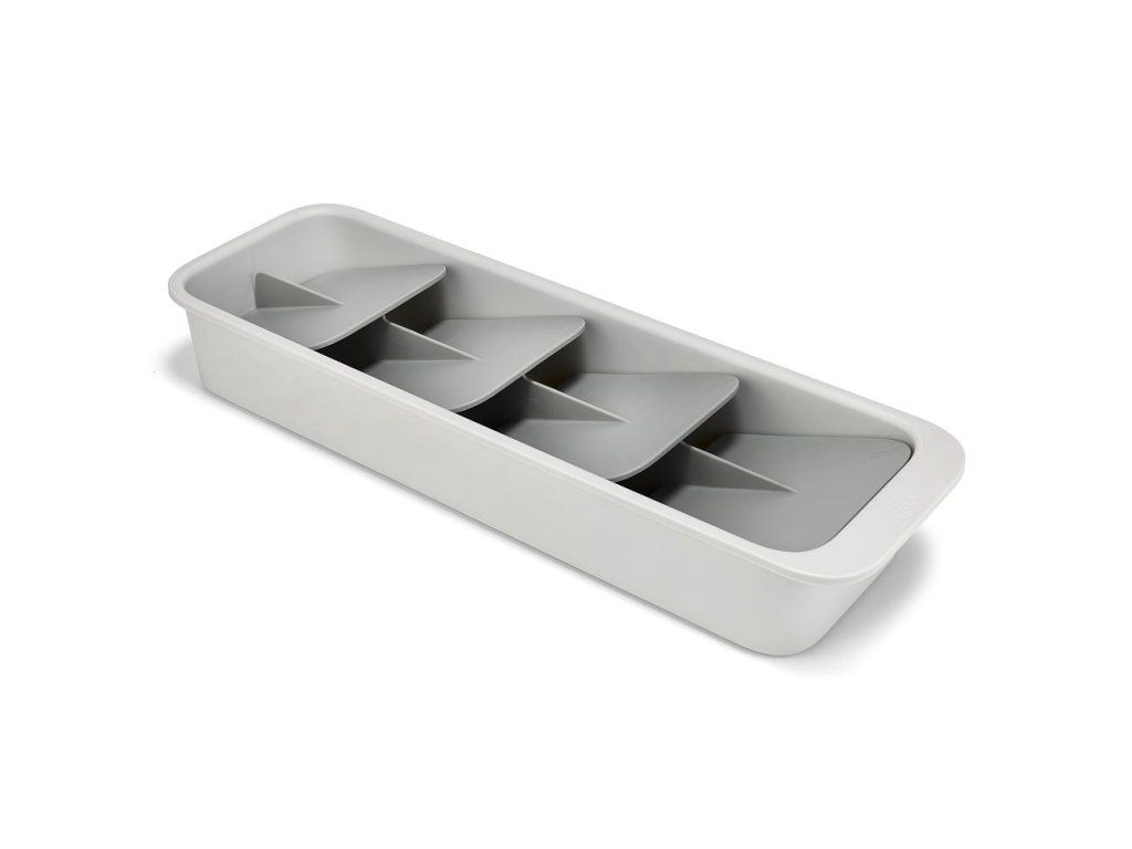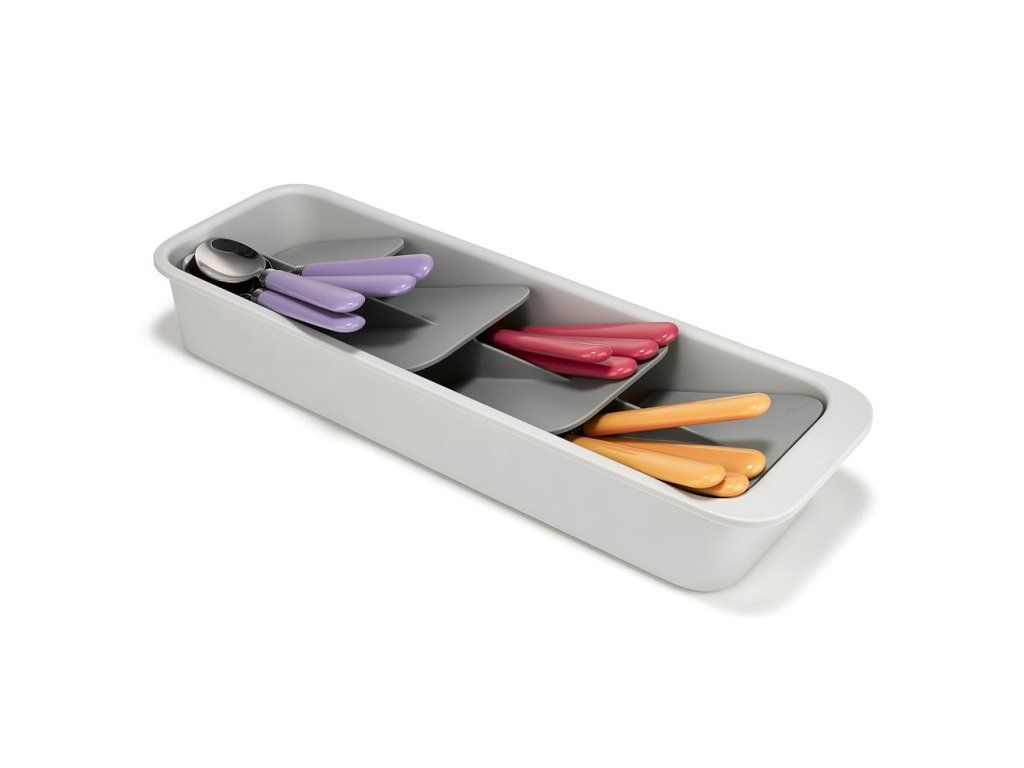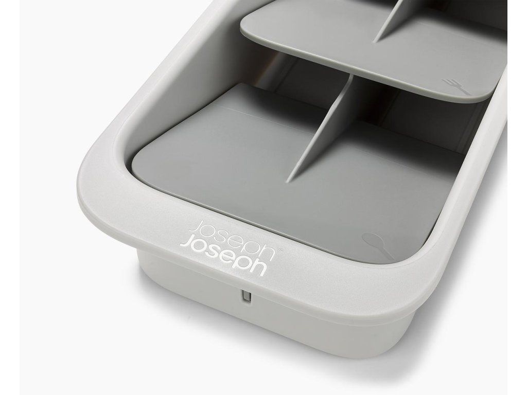 Kompaktní organizér příborů do zásuvky JOSEPH JOSEPH DrawerStore 8500011. Ukládáním příborů pod úhlem ušetříte více než polovinu místa ve vaší zásuvce. Příbory jsou ukládány do slotů označených ikonami. Pro zásuvky s minimální hloubkou 9 cm.
