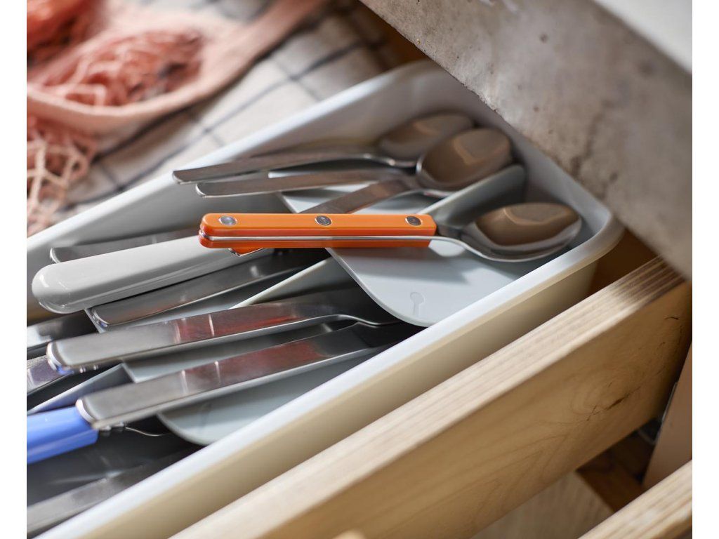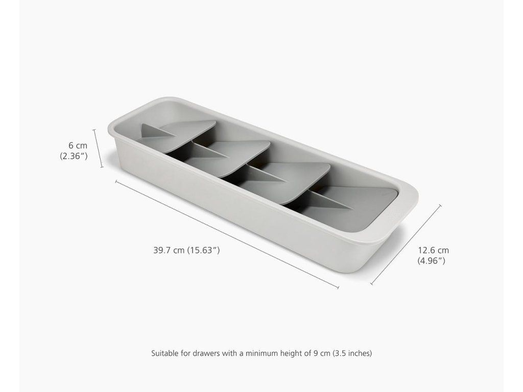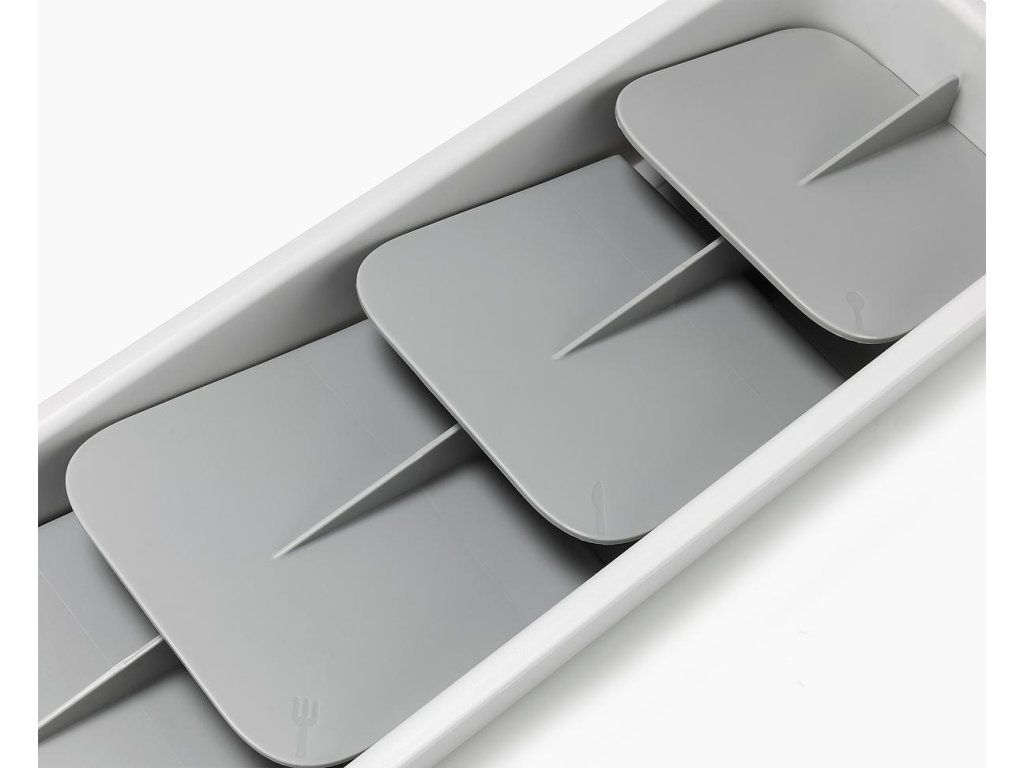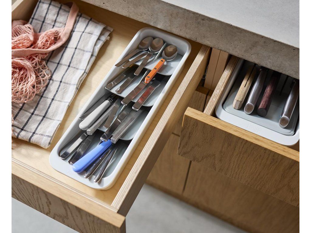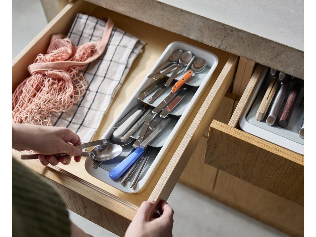 Kompaktní organizér příborů do zásuvky JOSEPH JOSEPH DrawerStore 8500011. Ukládáním příborů pod úhlem ušetříte více než polovinu místa ve vaší zásuvce. Příbory jsou ukládány do slotů označených ikonami. Pro zásuvky s minimální hloubkou 9 cm.