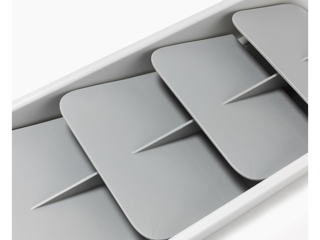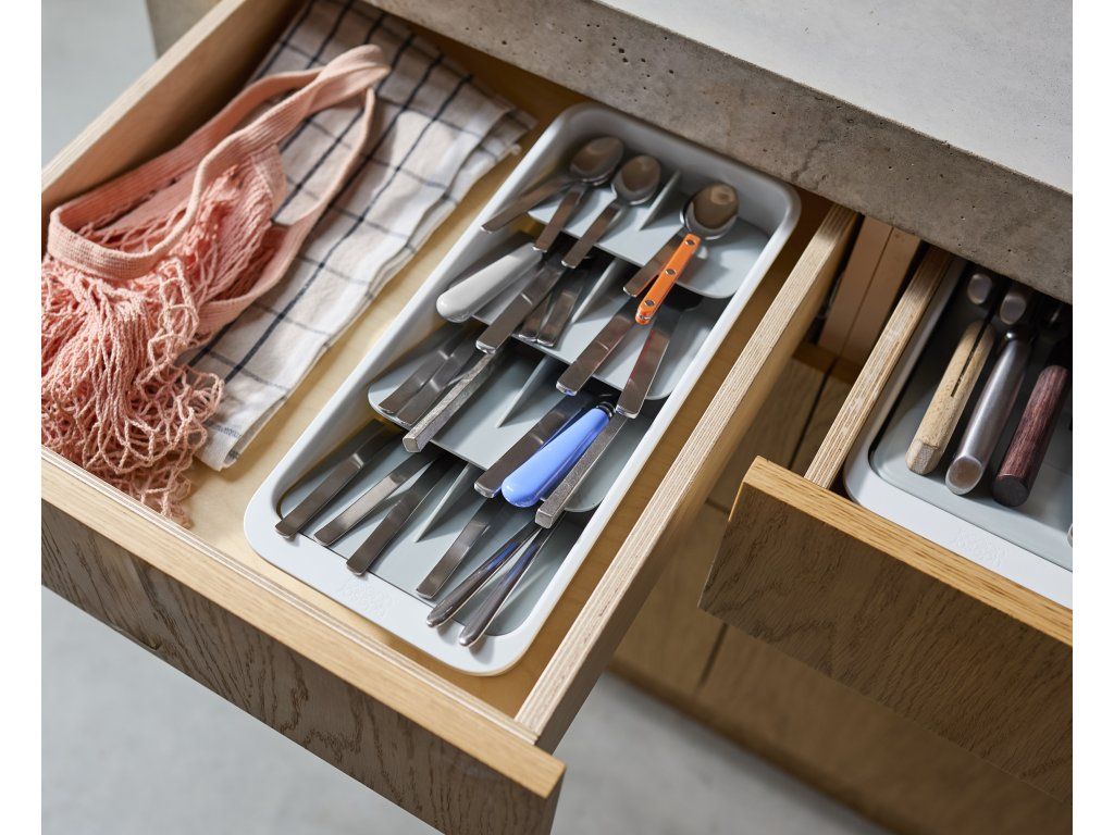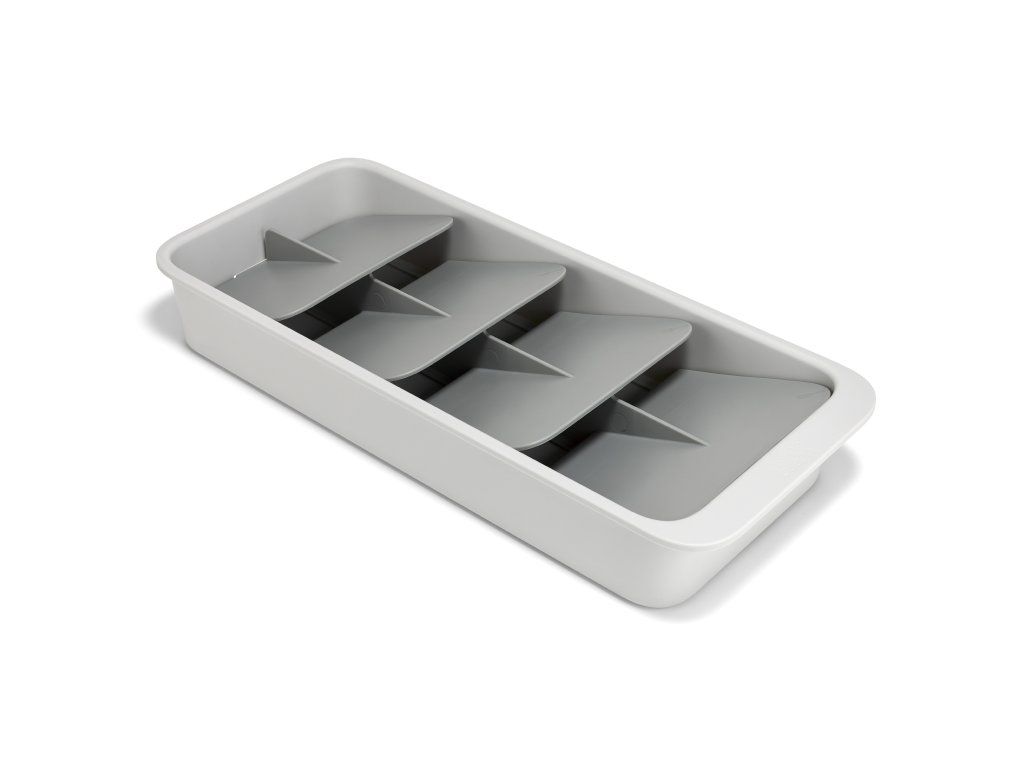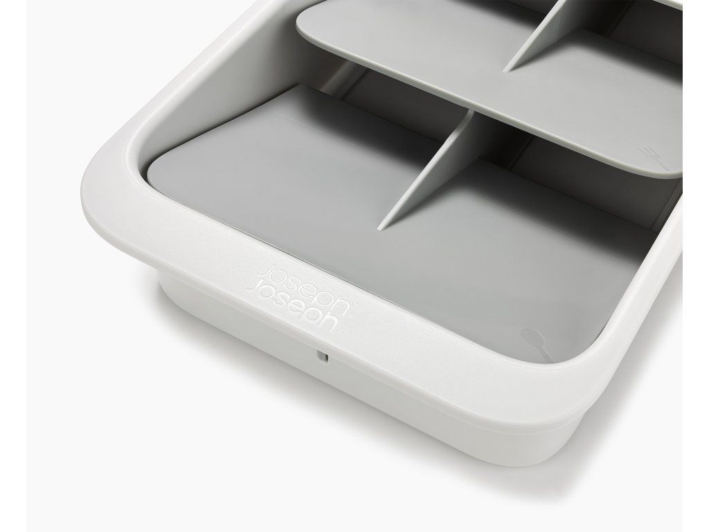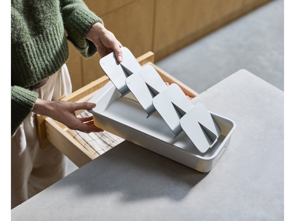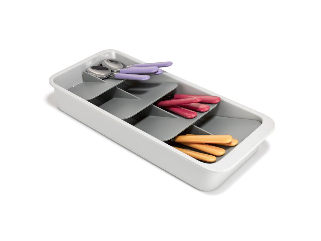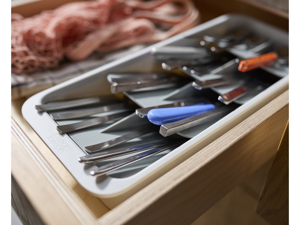 Kompaktní organizér příborů do zásuvky JOSEPH JOSEPH DrawerStore 8500012. Ukládáním příborů pod úhlem ušetříte více než polovinu místa ve vaší zásuvce. Příbory jsou ukládány do slotů označených ikonami. Pro zásuvky s minimální hloubkou 9 cm.