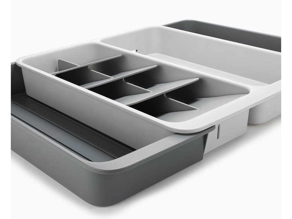 Roztažitelný organizér na příbory a kuchyňské náčiní – JOSEPH JOSEPH DrawerStore 8500014. Organizér s pěti hlubokými přihrádkami, dlouhou částí na špízy a rozkládacími boky na kuchyňské náčiní se přizpůsobí vašemu prostoru a zároveň udrží vše úhledně na svém místě. Přihrádky jsou označeny ikonami pro rychlou identifikaci. Vhodné pro zásuvky s minimální výškou 9 cm.