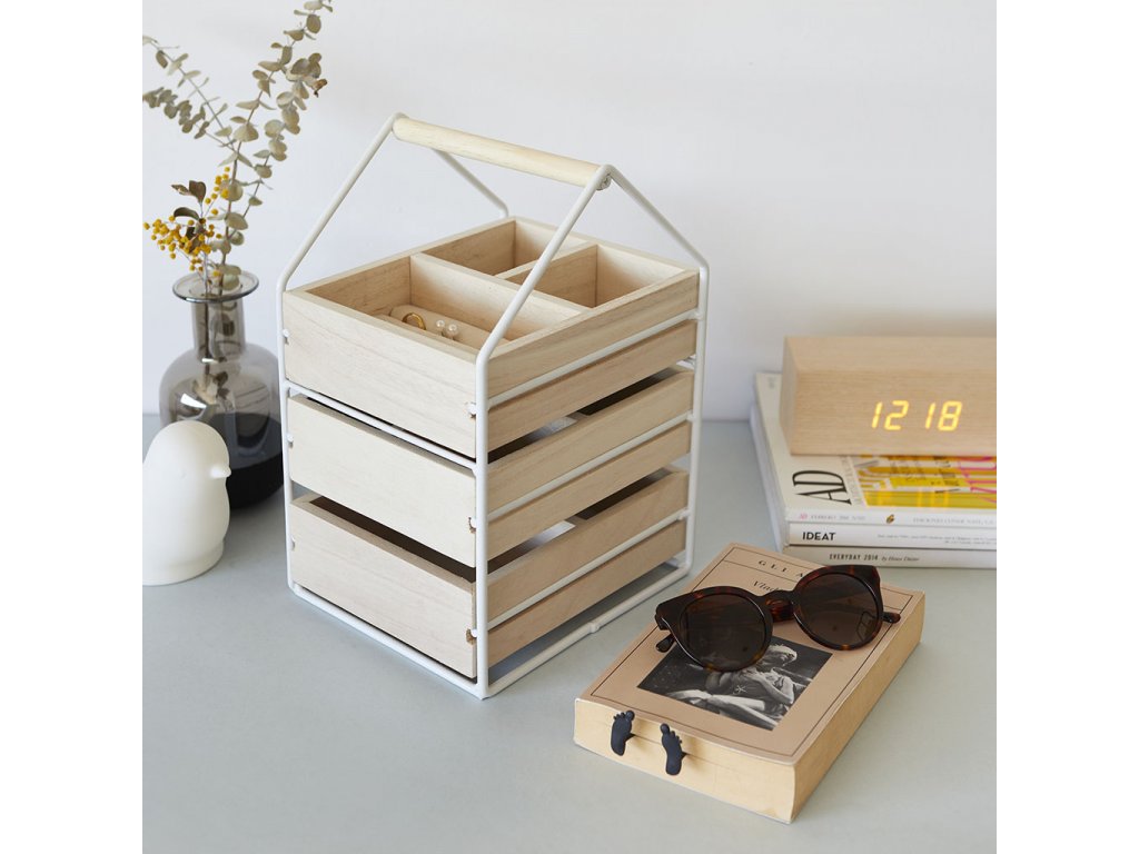 Univerzální organizér BALVI Wood na všechny druhy šperku - prstýnky, náušnice, řetízky, náhrdelníky. Vše ve třech zásuvkách ze světlého dřeva. Vnitřky zásuvek vystlané sametem. Velikost: 30 x 19,5 x 17 cm.