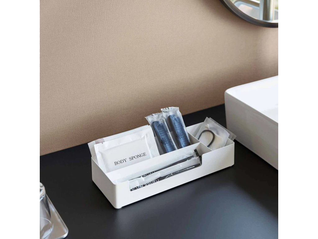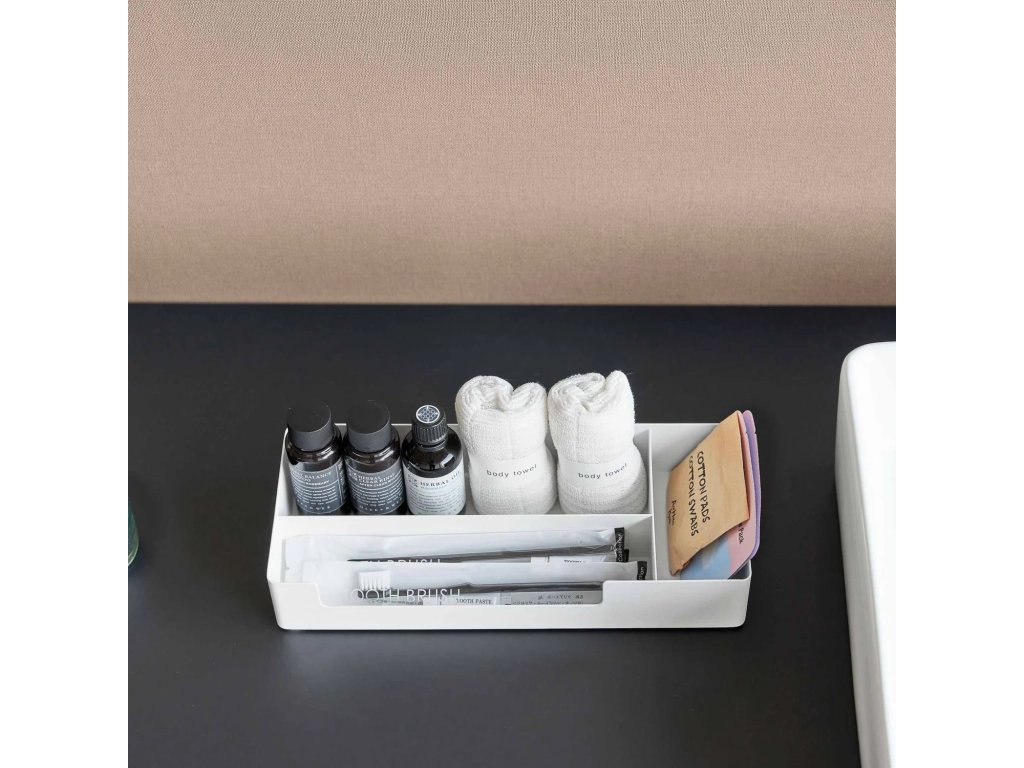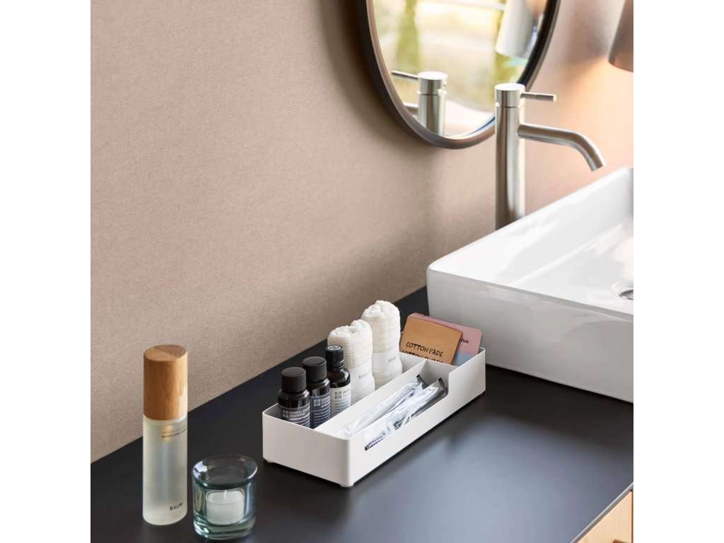 Kovový organizér/tácek se třemi přihrádkami k uspořádání drobných nezbytnosti v koupelně nebo na pracovním stole. Dodáváno v bílé (10338) a černé barvě (10339). Čistěte navlhčeným hadříkem.