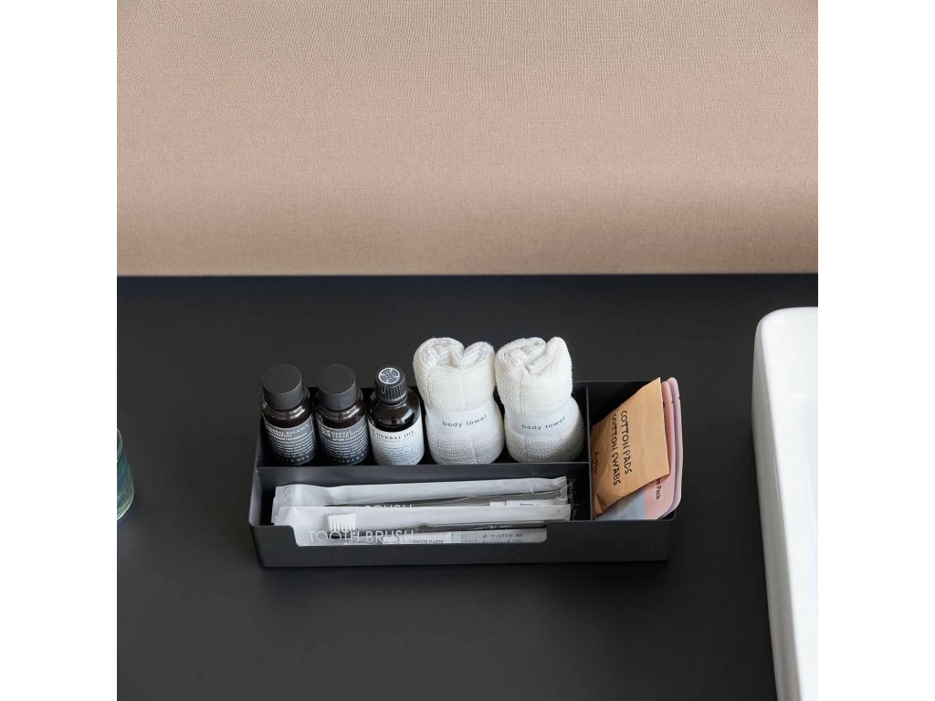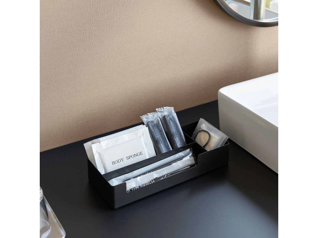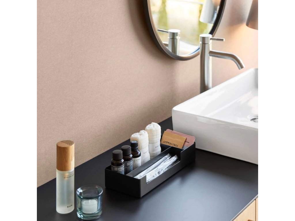 Kovový organizér/tácek se třemi přihrádkami k uspořádání drobných nezbytnosti v koupelně nebo na pracovním stole. Dodáváno v bílé (10338) a černé barvě (10339). Čistěte navlhčeným hadříkem.