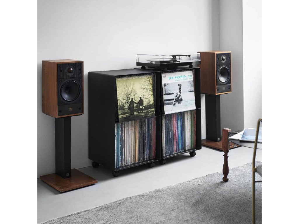 Pojízdné kovové poličky pro úhledné uspořádání LP desek – YAMAZAKI Tower 10229 (bílý) / 10230 (černé). Maximální zatížitelnost: 5kg (horní plocha), 25kg (vnitřní police).