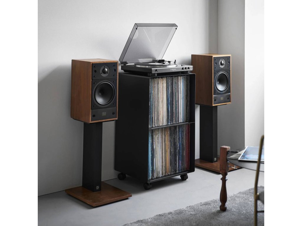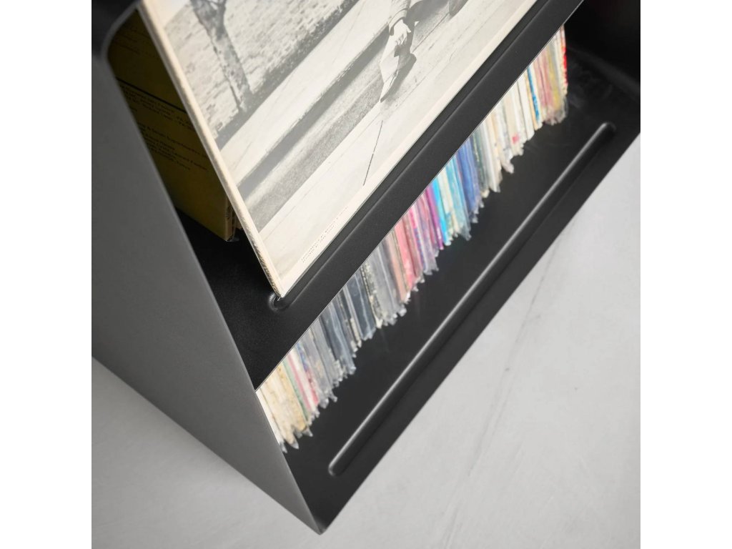 Pojízdné kovové poličky pro úhledné uspořádání LP desek – YAMAZAKI Tower 10229 (bílý) / 10230 (černé). Maximální zatížitelnost: 5kg (horní plocha), 25kg (vnitřní police).