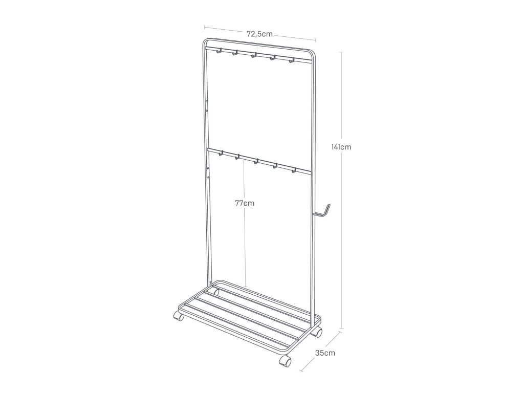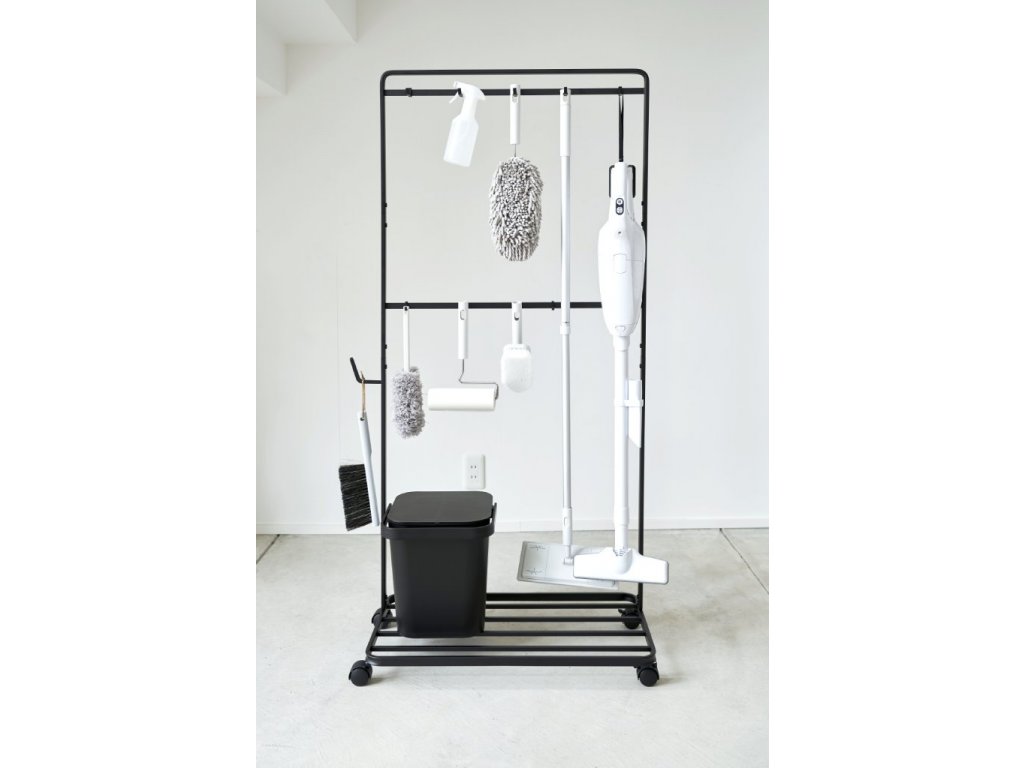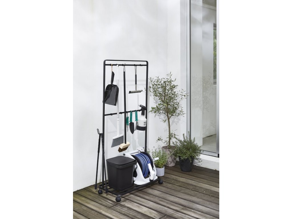 Stojan YAMAZAKI Tower 4347 Storage Rack - pojízdný univerzální stojan k umístění do prádelny, garáže nebo kůlny / k přehlednému uskladnění úklidových prostředků, zahradnického náčiní, nářadí. Dodáván včetně 5 malých a 5 velkých plastových háčků k umístění na vodorovné konzole. Materiál: lakovaný kov.