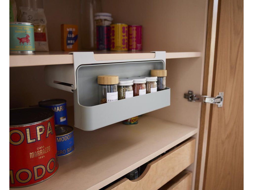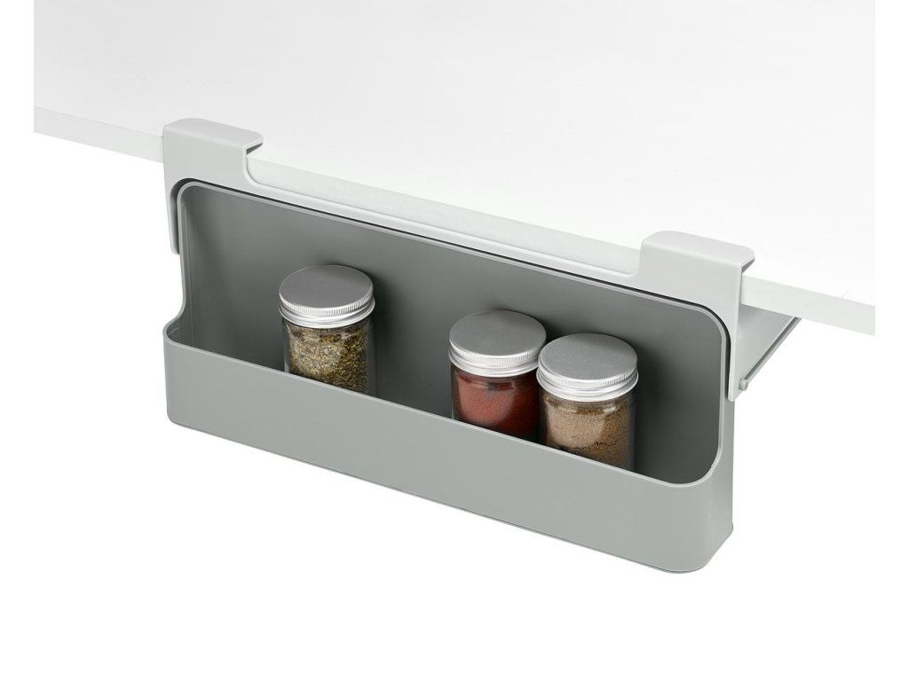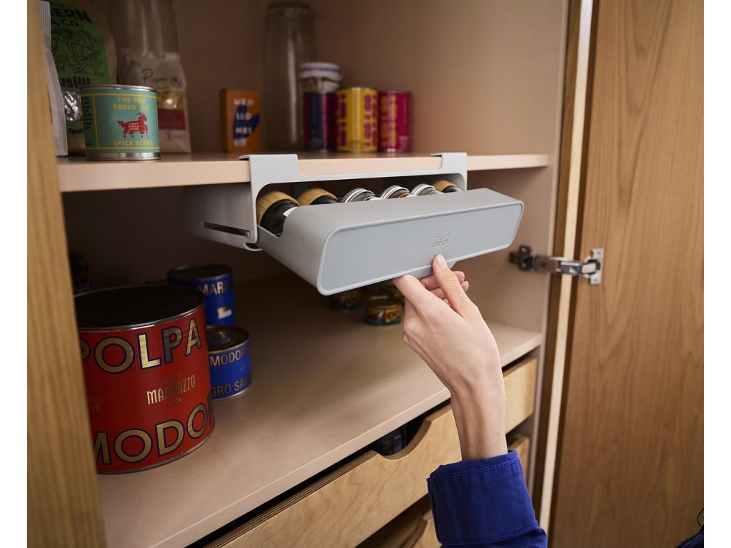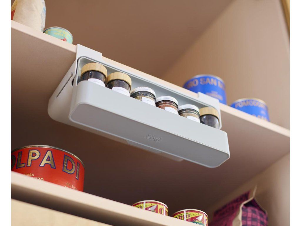 Praktická vyklápěcí polička na kořenky JOSEPH JOSEPH CupboardStore 8500021 k umístění do nevyužitého prostoru pod policí kuchyňské skříňky. Organizér je dodáván prázdný – bez kořenek. Uložit do něj můžete až 7 kořenek - max.velikost 5 x 5 x 12 cm (kulatého i kubického tvaru - u nás dodávány včetně náplně např. v síti obchodů Delmart). Snadná instalace pomocí samolepící 3M pásky. Určena pro skříňky s vnitřní hloubkou alespoň 32 cm / max. tloušťka poličky 2 cm.