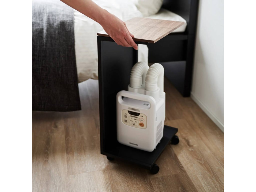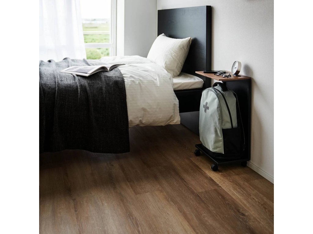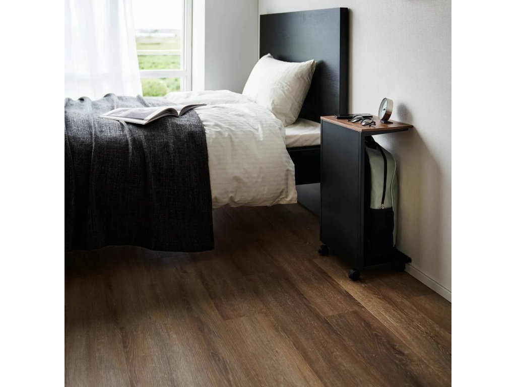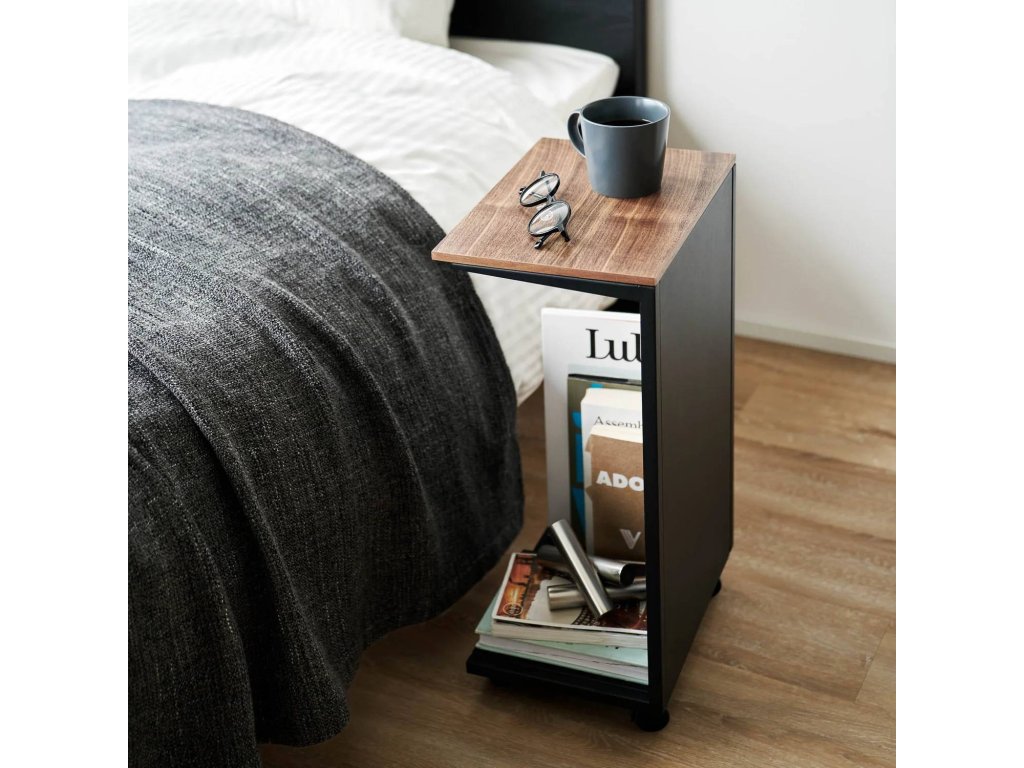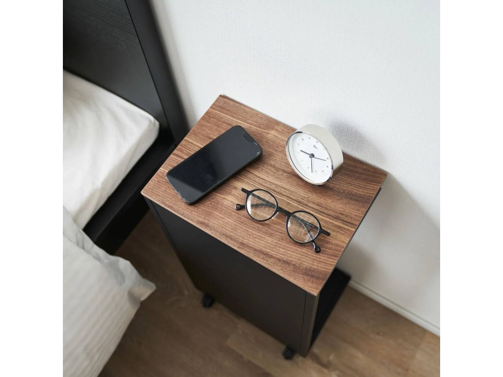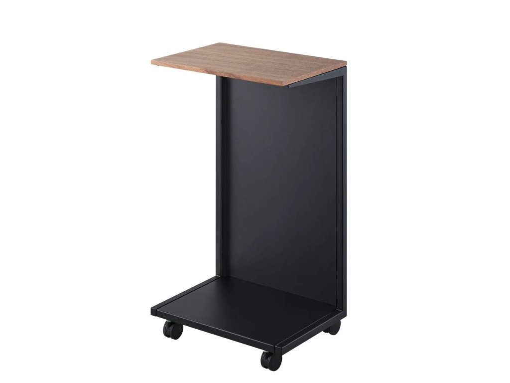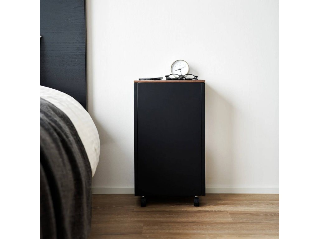 Kovový odkládací stolek s dřevěnou deskou a kolečky – YAMAZAKI Tower 1415 (bílý) 1416 (černý). Diskrétní zadní panel po otočení skryje obsah a zachová tak úhledný a stylový vzhled. Je ideální jako noční a odkládací stolek. Po vyjmutí koleček lze užít i stacionárně (dodáváno i se 4 plochými nožičkami). Dřevovláknitá deska je dýhovaná přírodní dýhou.