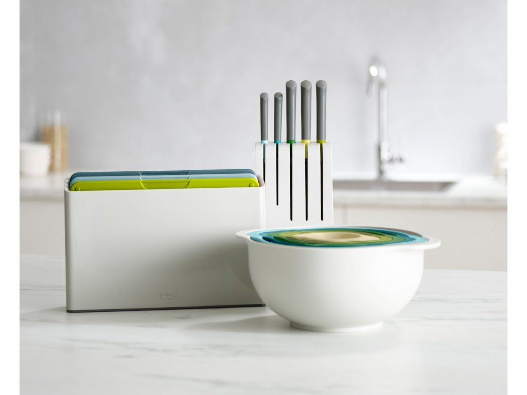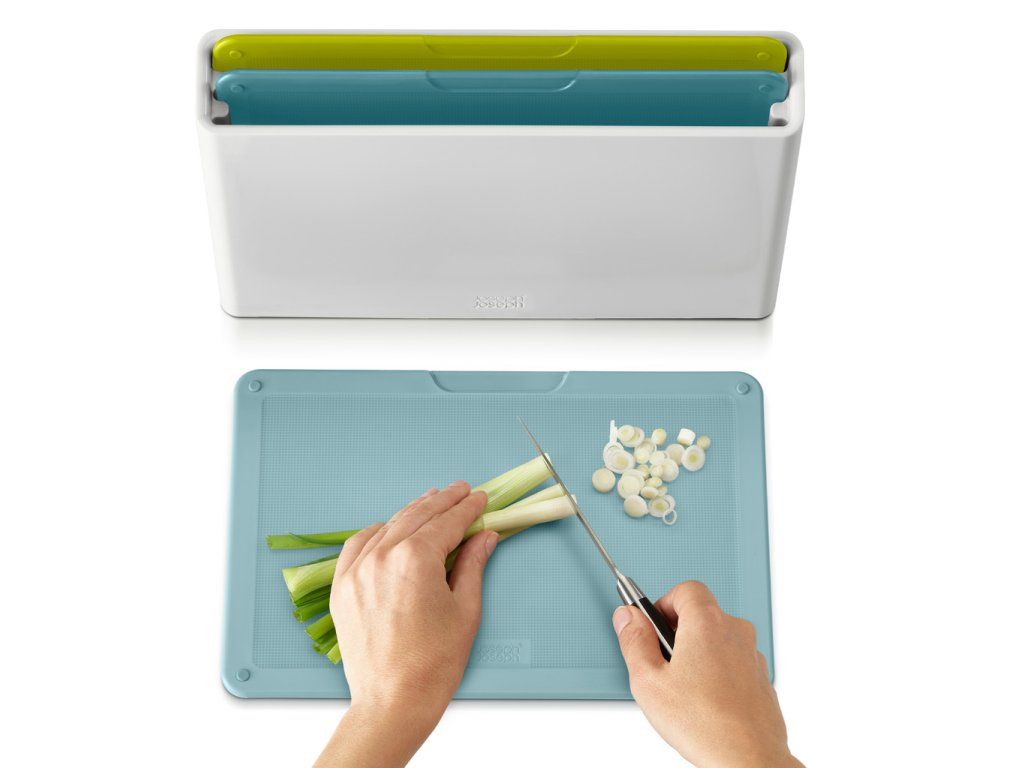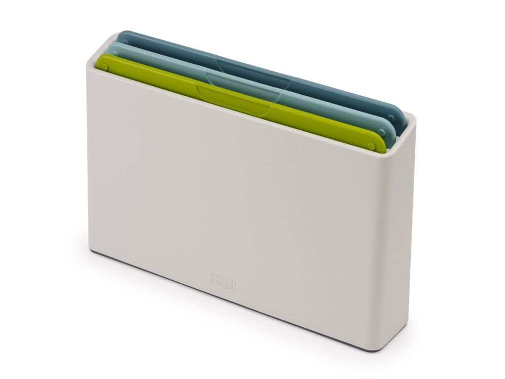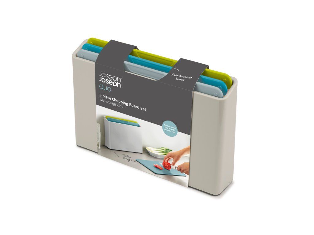 Sada JOSEPH JOSEPH Duo 60179 obsahuje 3 plastová barevně rozlišená prkénka určená pro hygienicky oddělené krájení potravin. Každé prkénko má protiskluznou úpravu a zvýšený okraj proti stékání. Díky oddělenému umístění prkénka ve stojanu Duo snadno osychají. Materiál: polypropylen, termoplastická guma, ABS.