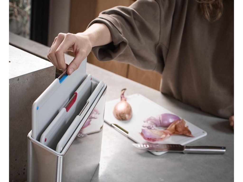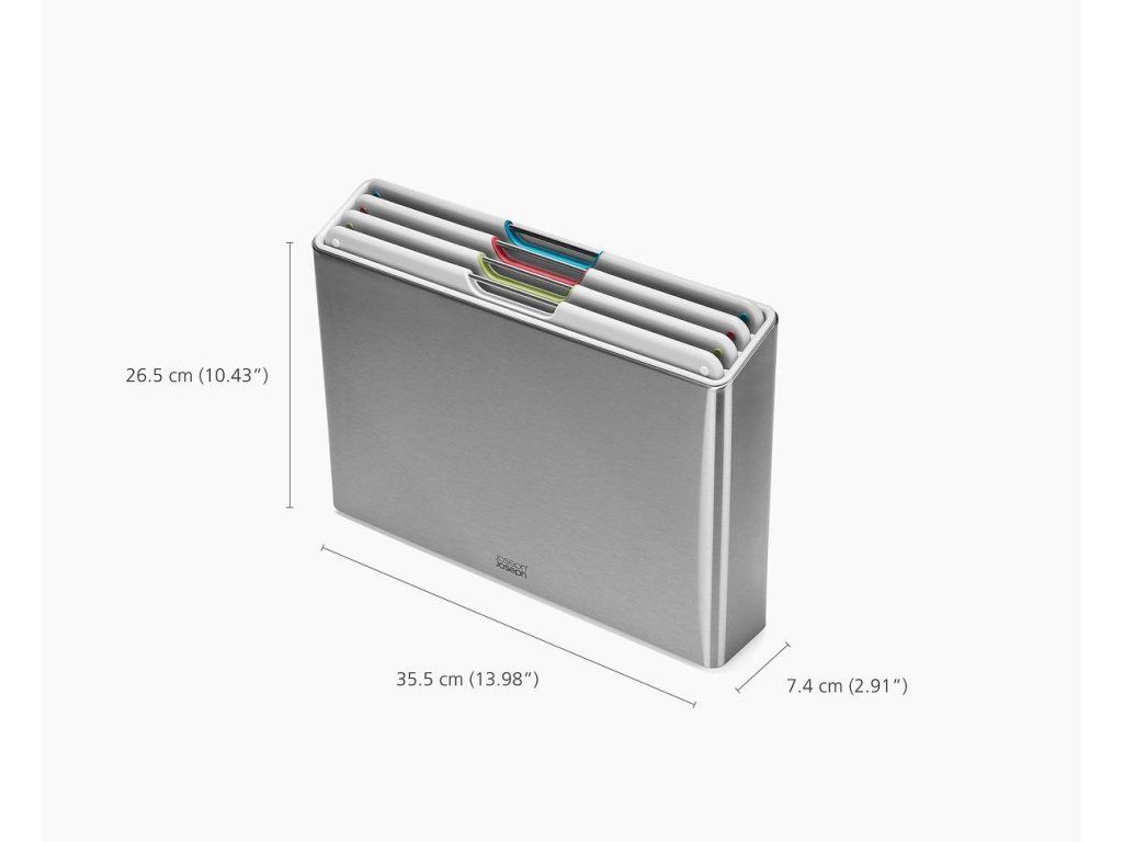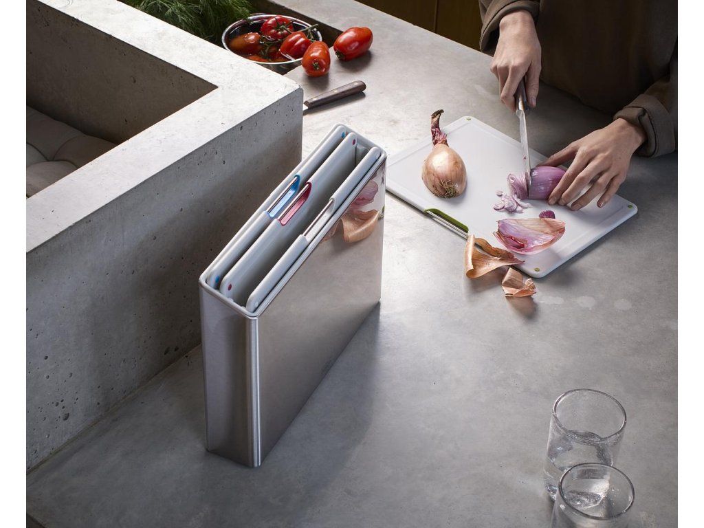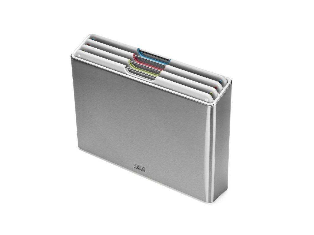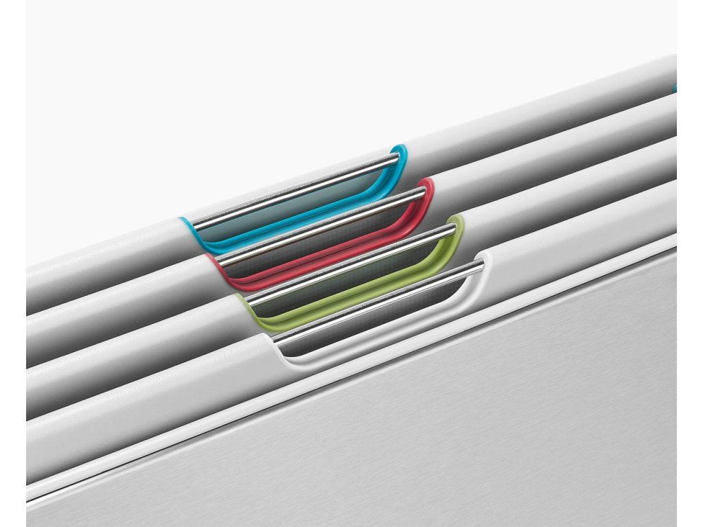 Sada čtyř černých prkének v luxusním kovovém stojanu JOSEPH JOSEPH Folio Steel . Prkénka určená pro hygienicky oddělené krájení potravin. Vyjmutí prkének ze stojanu usnadňují nerezová madélka. Každé prkénko má protiskluznou úpravu a zvýšený okraj proti stékání. Díky oddělenému umístění a cirkulaci vzduchu prkénka ve stojanu Folio snadno osychají. Stojan Folio Steel má matnou nerezovou povrchovou úpravu.