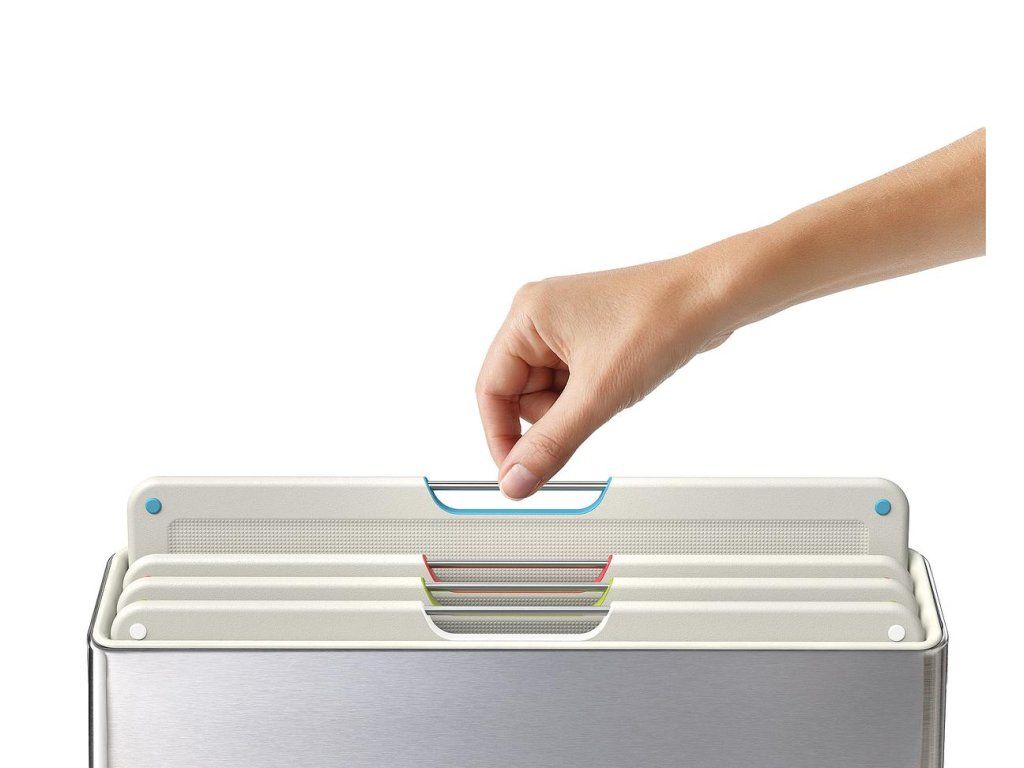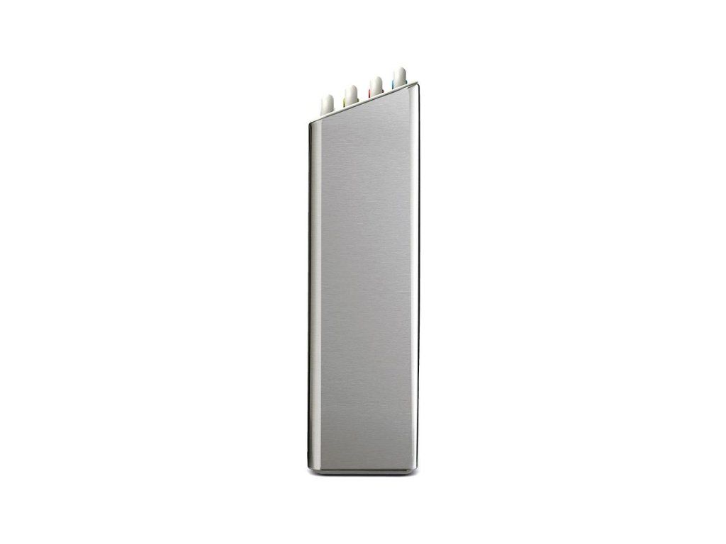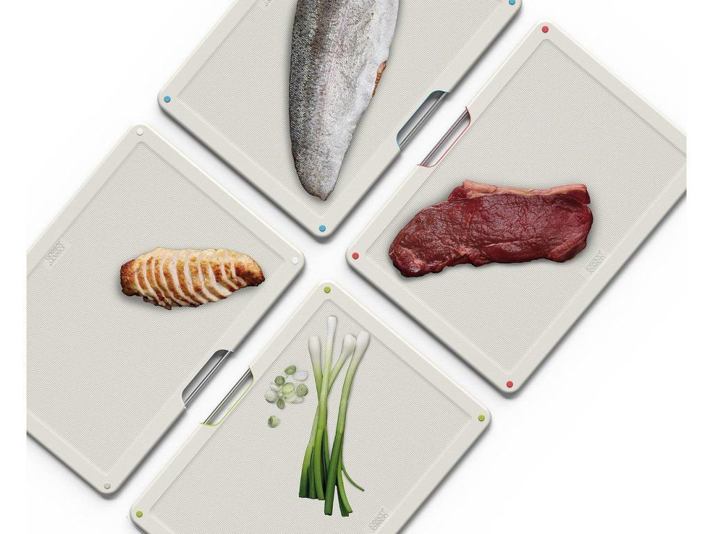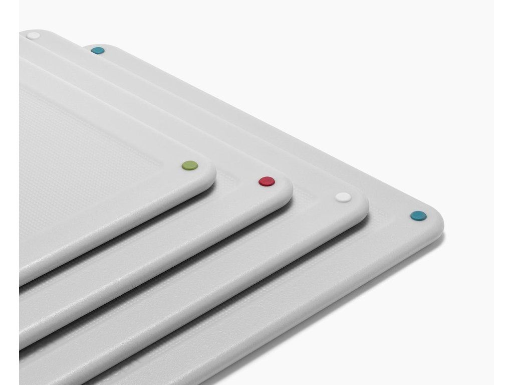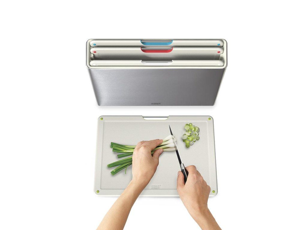 Sada čtyř černých prkének v luxusním kovovém stojanu JOSEPH JOSEPH Folio Steel . Prkénka určená pro hygienicky oddělené krájení potravin. Vyjmutí prkének ze stojanu usnadňují nerezová madélka. Každé prkénko má protiskluznou úpravu a zvýšený okraj proti stékání. Díky oddělenému umístění a cirkulaci vzduchu prkénka ve stojanu Folio snadno osychají. Stojan Folio Steel má matnou nerezovou povrchovou úpravu.