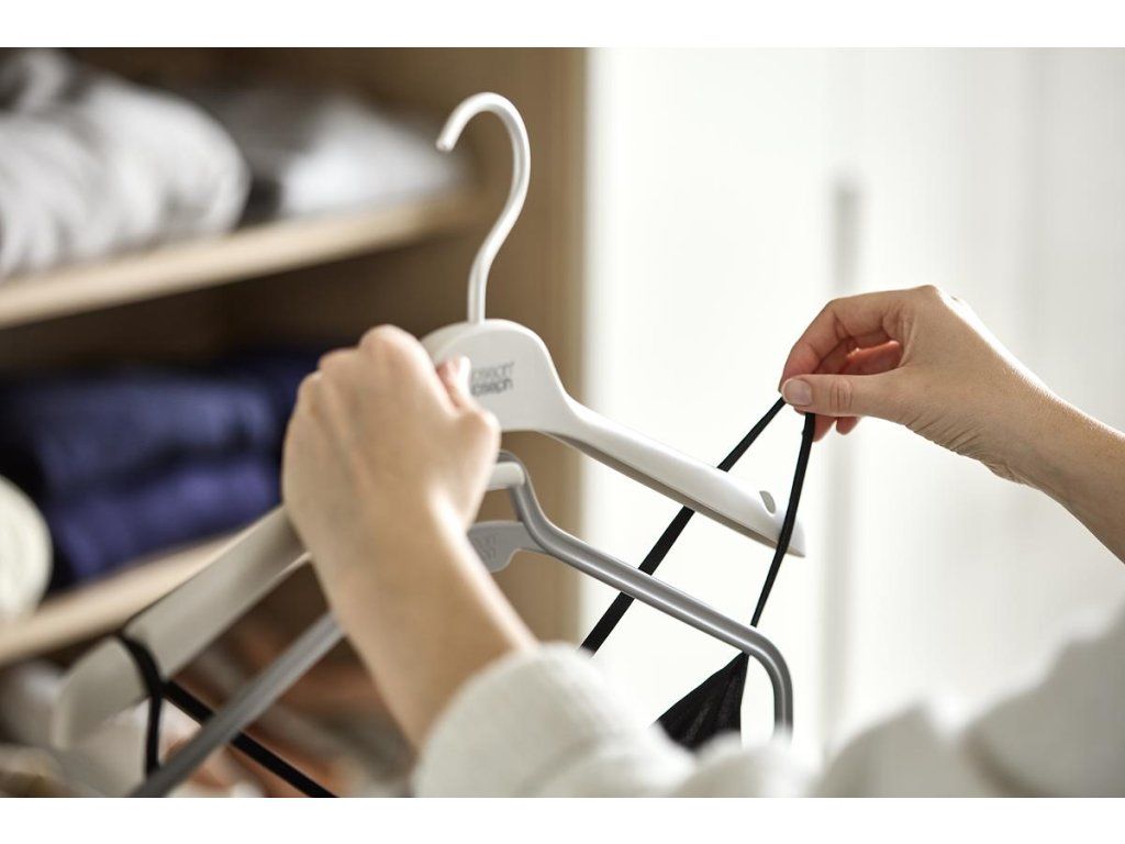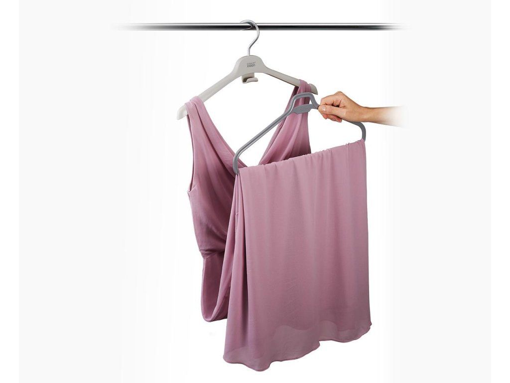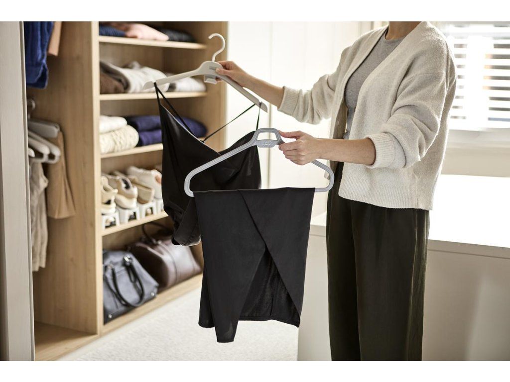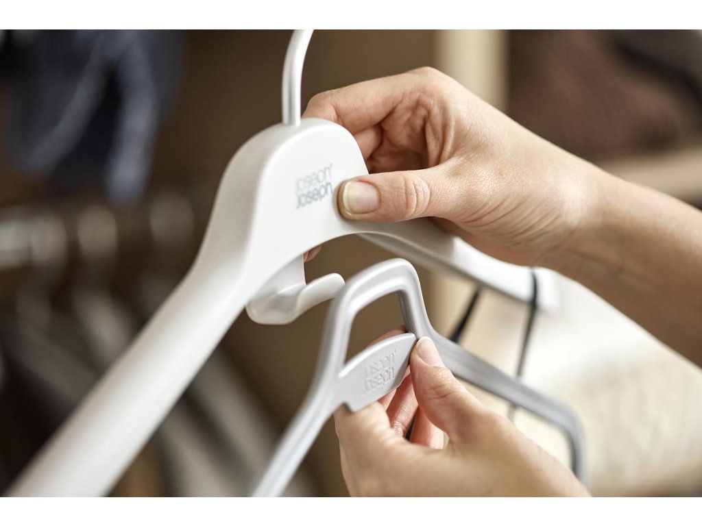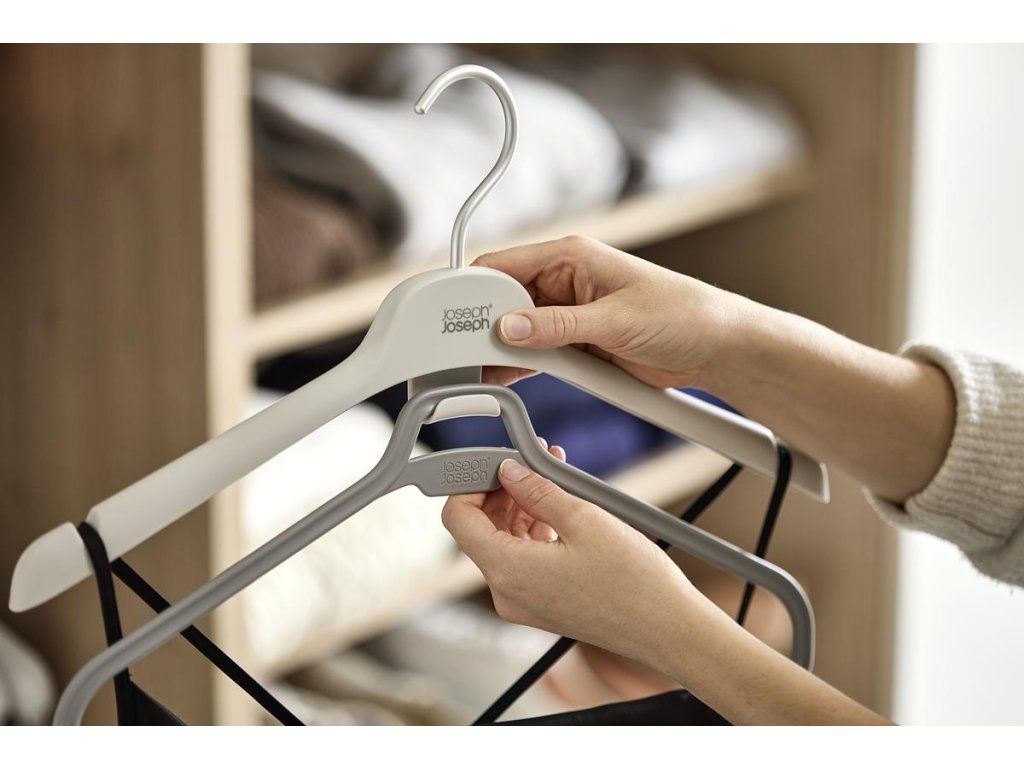 Sada 2 ks ramínek JOSEPH JOSEPH Orderly 55018 pro bezproblémové zavěšení delších oděvů. Inovativní 2dílné ramínko zkracuje a chrání delší oblečení při zavěšení tak, aby se nedostalo do kontaktu s nečistotami nebo předměty pod ním. Ideální pro delší kusy, jako jsou šaty nebo kombinézy. Integrované popruhové háčky na ramenních oporách pro bezpečné uchycení oděvů. Vhodné pro použití s lehkým oblečením. Nepřetěžujte těžkými předměty, aby nedošlo k deformaci závěsu. Barevné provedení Ecru (barva surového hedvábí resp. neběleného plátna).