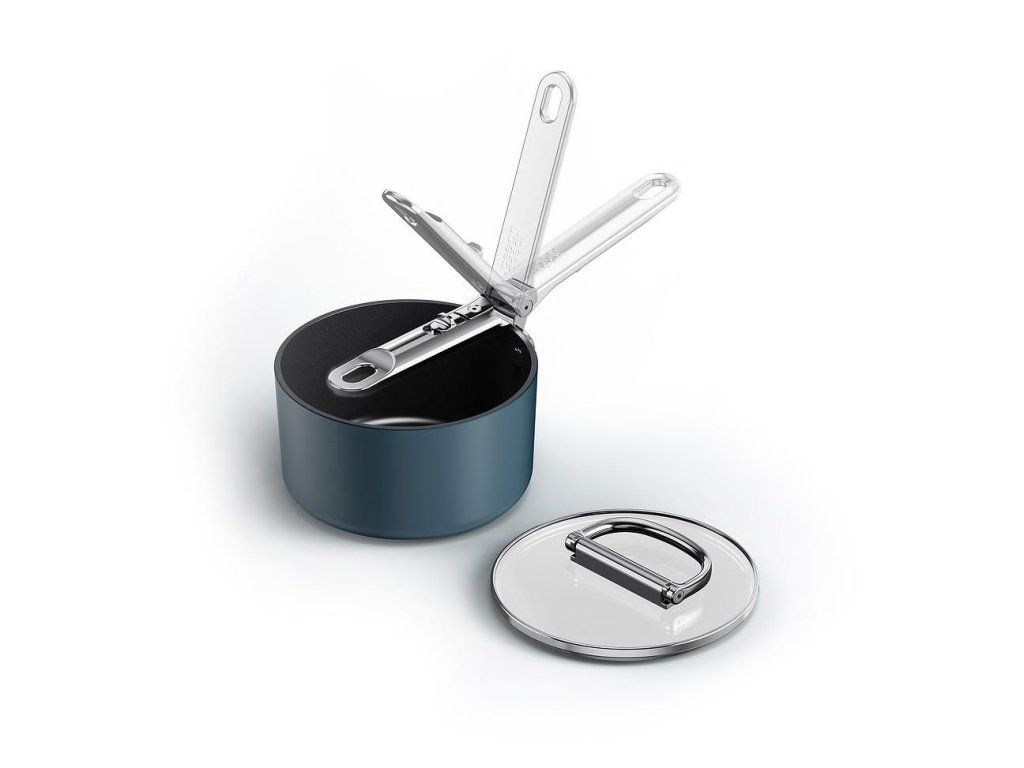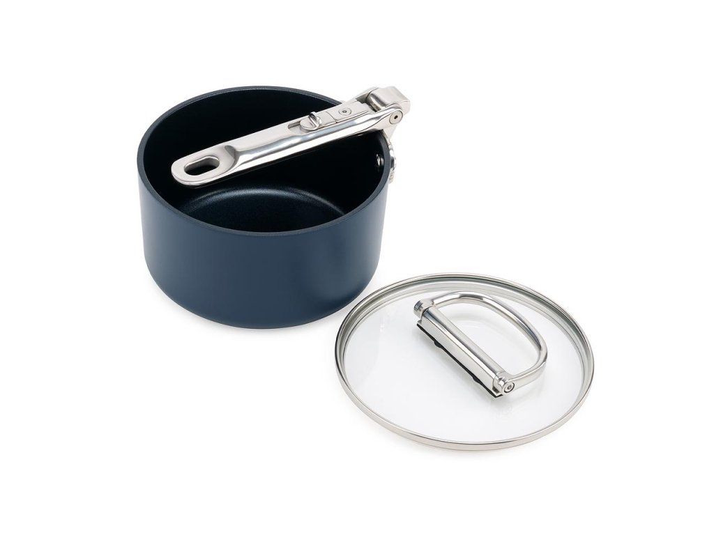 prémiová řada nádobí profesionální kvality a inovativního designu. Nejkompaktnější nádobí pro prostorově úsporné skladování. Barva Midnight Blue.