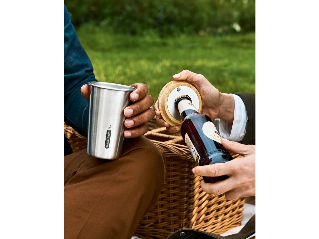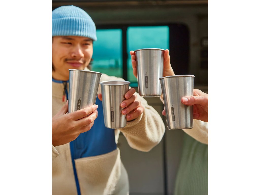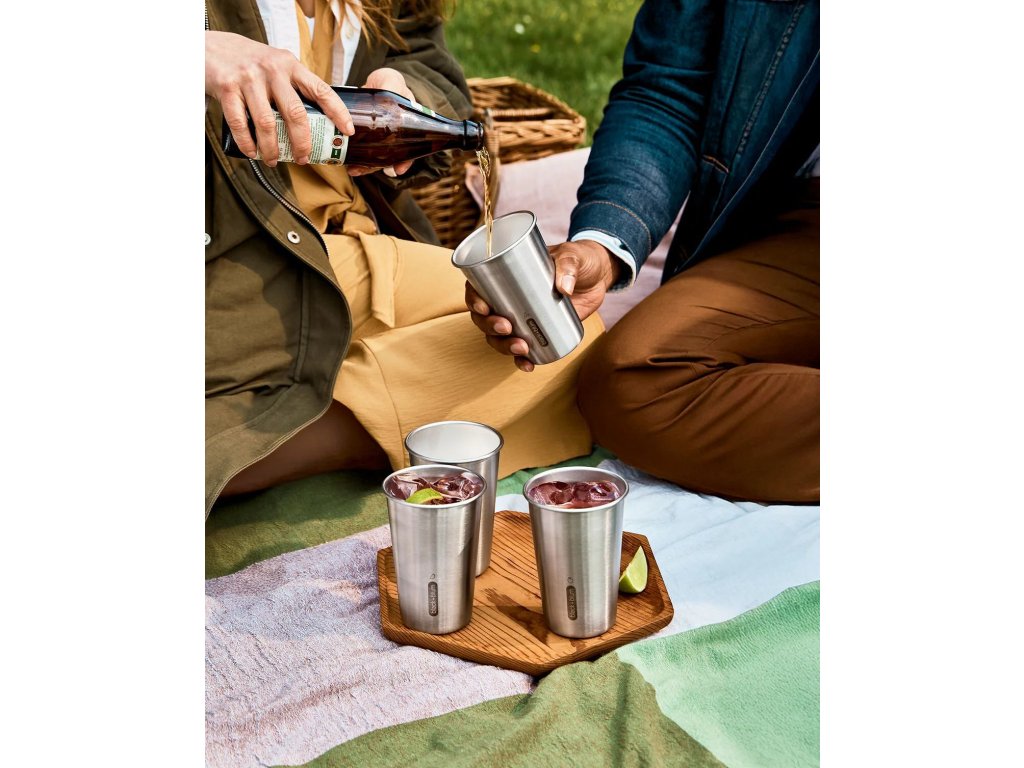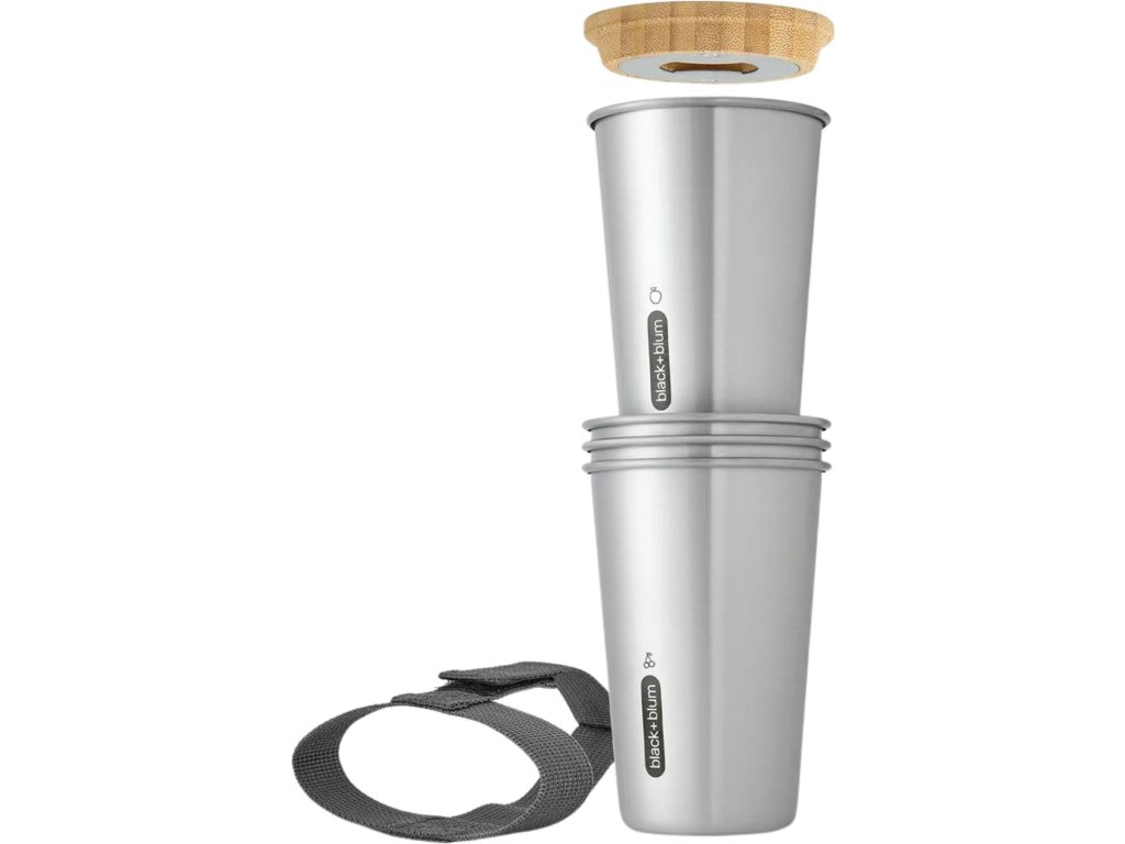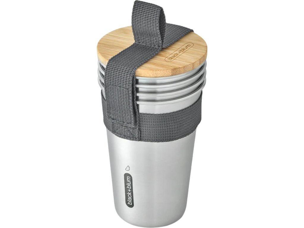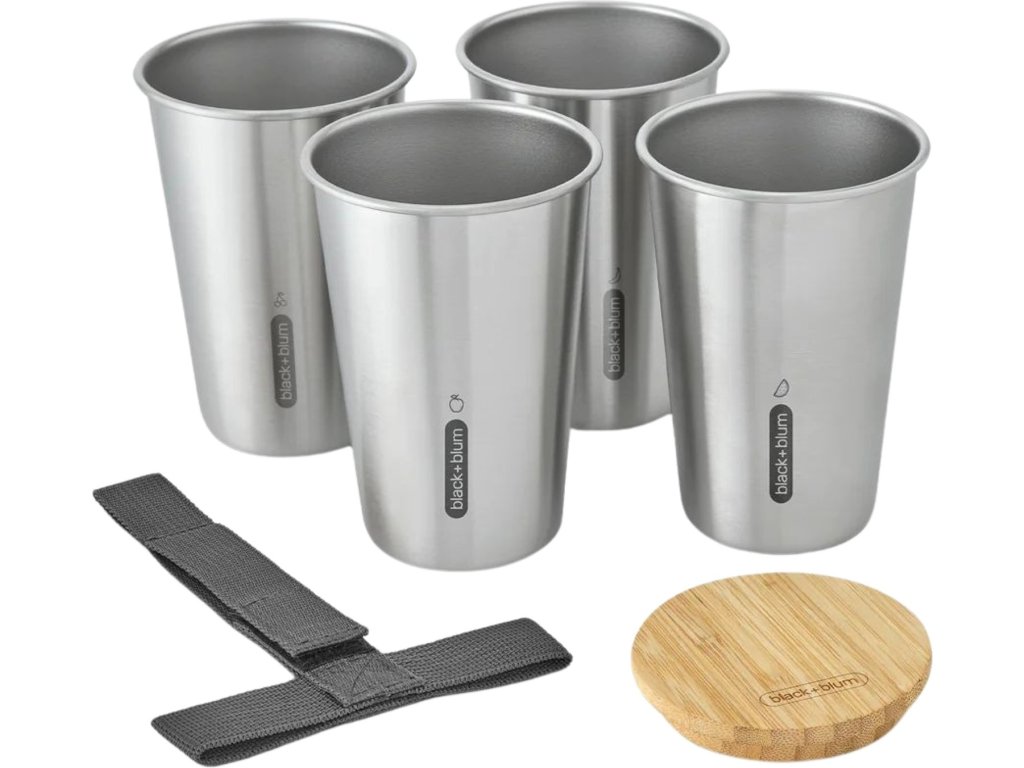Sada 4 lehkých stohovatelných nerezových kelímků o objemu 500 ml dodávaných s bambusovýmivíčkem s vestavěným otvírákem lahví. Kelímky jsou vyrobeny z nerezové oceli (304/19-8) o tloušťce 0,4 mm. Každý kelímek je individuálně označen, takže vždy poznáte, který je váš. Bambusové víčkp lze užít i jako malé prkénko ke krájení limetek nebo máty do nápojů. Odolný nylonový popruh drží vše pohromadě pro snadné přenášení. Kelímky je možné mýt v myčce.