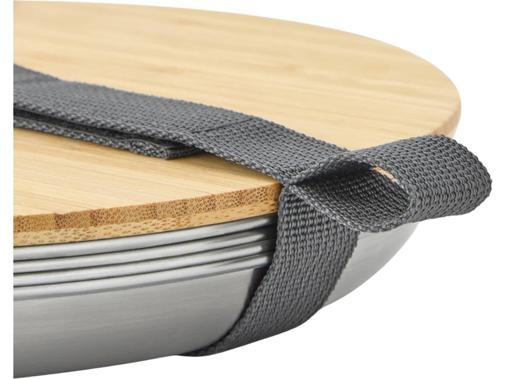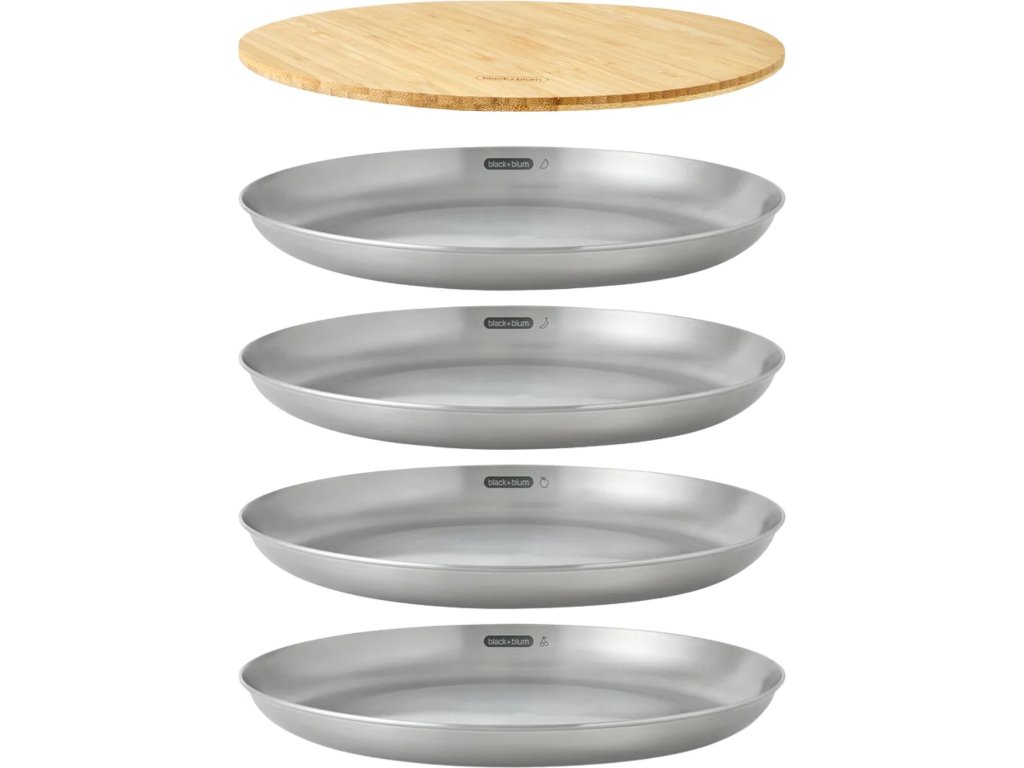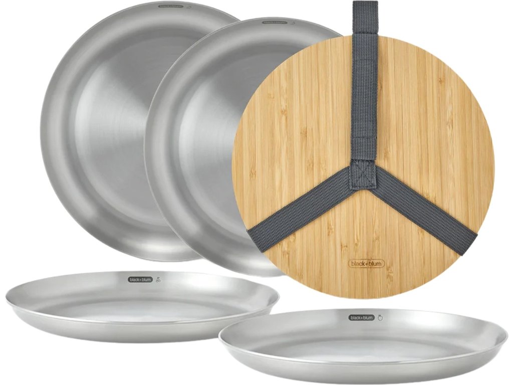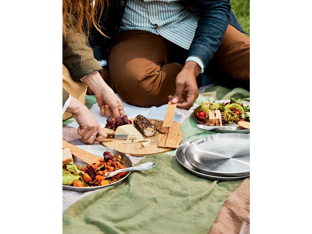 Sada 4 lehkých piknikových talířů z nerezové oceli. Talíře se úhledně stohují a jsou dostatečně široké pro všechny vaše venkovní hostiny. Odolný nylonový popruh je pevně drží pohromadě a usnadňuje jejich přenášení. Každá sada piknikových talířů je dodávána také s bambusovým prkénkem na krájení, přípravu nebo servírování, které zároveň pomáhá zakrýt zbytky při přenášení použitého nádobí na cestě domů. Každý talíř je vyroben z nerezové oceli o tloušťce 0,4 mm. Talíře jsou vhodné do myčky nádobí. Bambusové prkénko je přirozeně antibakteriální. Materiály: nerezová ocel 304/18-8, přírodní bambus, nylon.