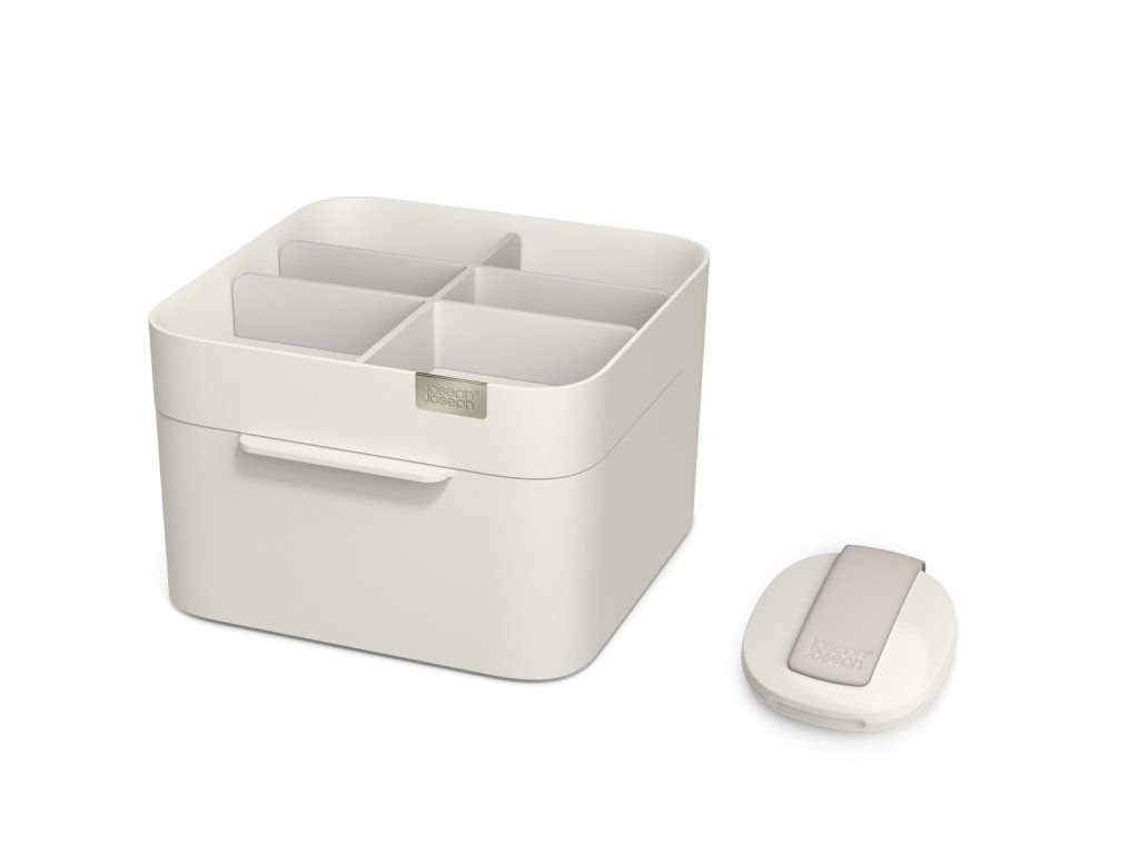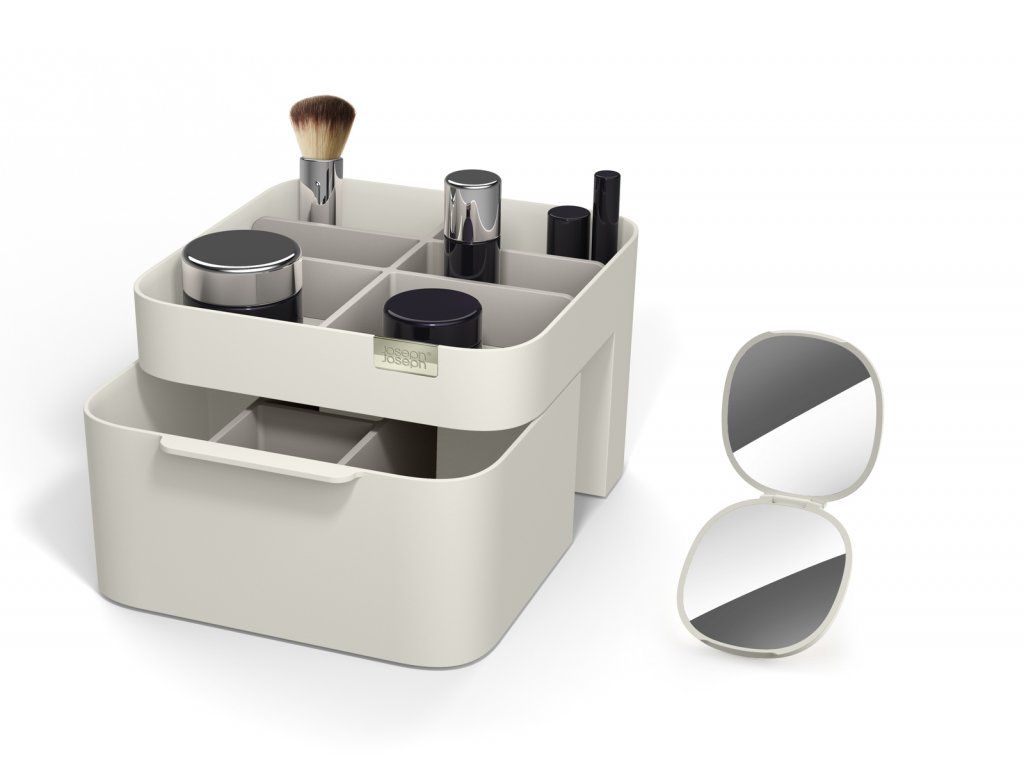 Stylový organizér na kosmetiku a doplňky JOSEPH JOSEPH Viva 7504. Hluboké přihrádky na štětce, řasenky a tužky na oční linky. Mělké přihrádky na balzámy na rty, pudřenky a oční stíny. Zásuvka s magnetickým uzávěrem na vatové tampony, vatové tyčinky a houbičky na odlíčení. Příznivci značky ocení chromované logo na předním okraji organizéru. Vnitřní přihrádky jsou odnímatelné. Čistěte ručně, vlhkým hadříkem. Velikost: 12 x 18,5 x 19,5 cm.