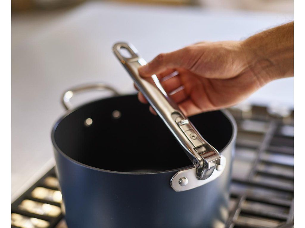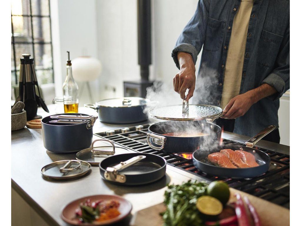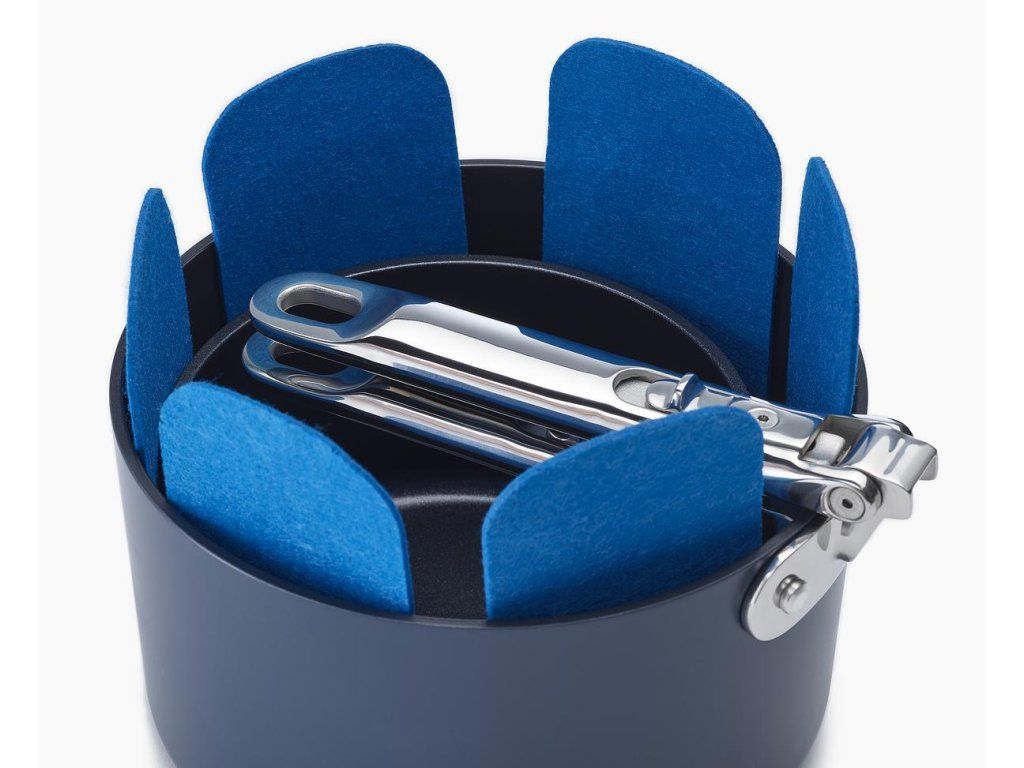 prémiová řada nádobí profesionální kvality a inovativního designu. Nejkompaktnější nádobí pro prostorově úsporné skladování. Barva Midnight Blue.
