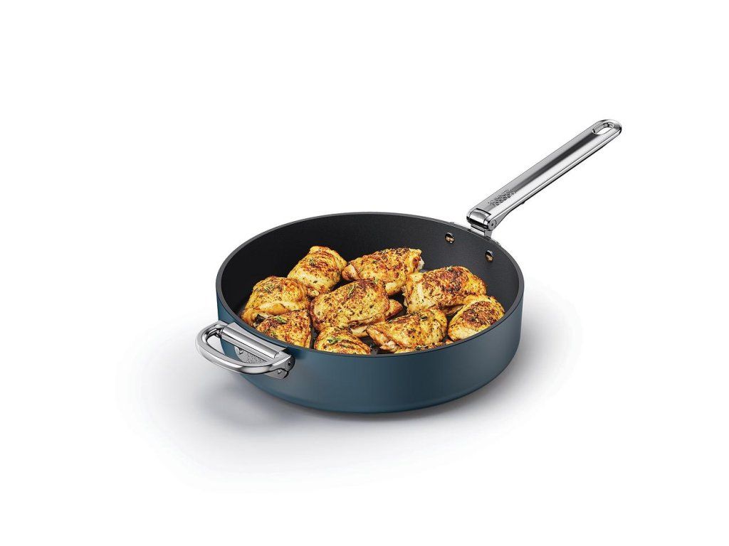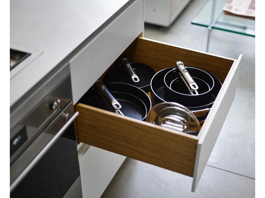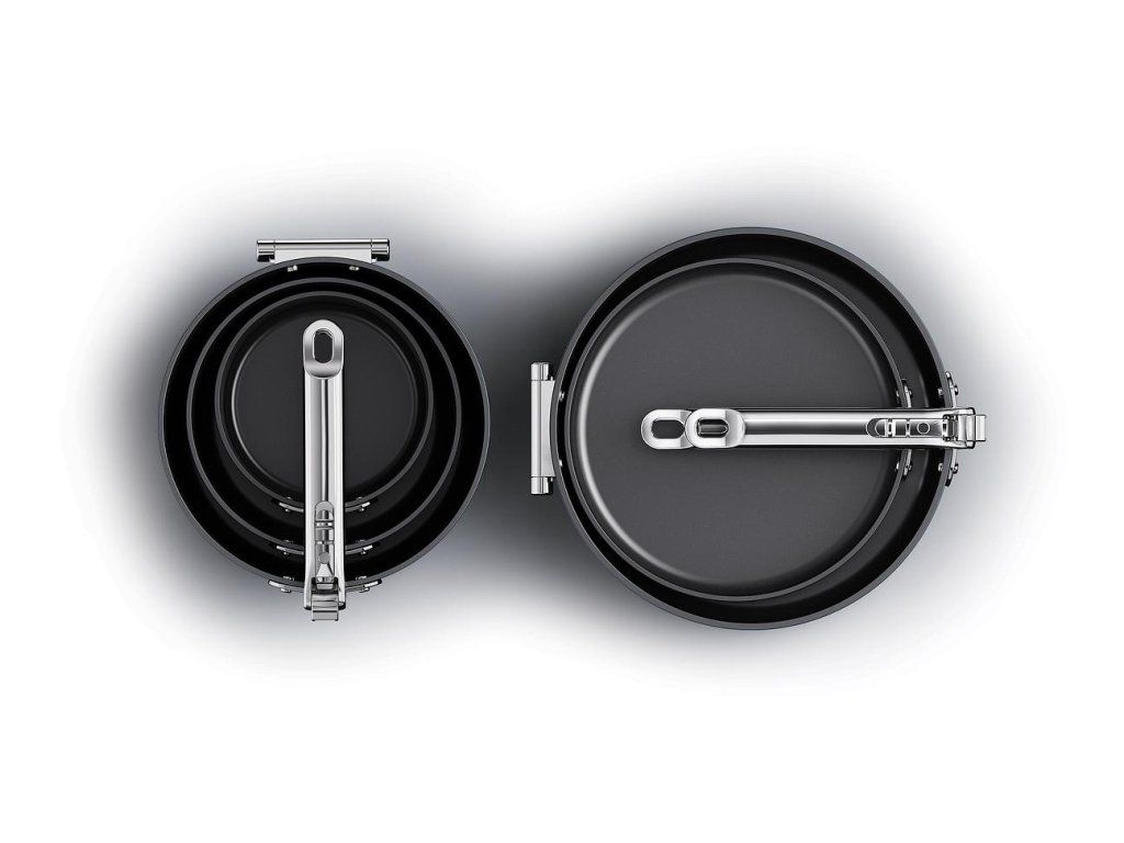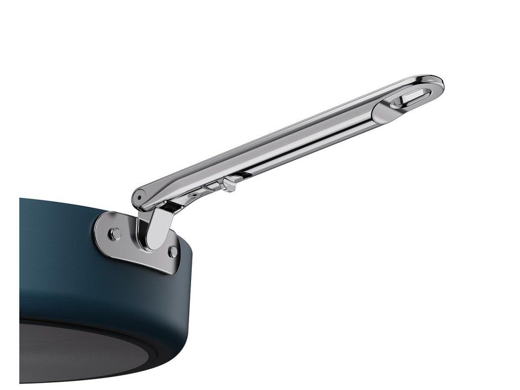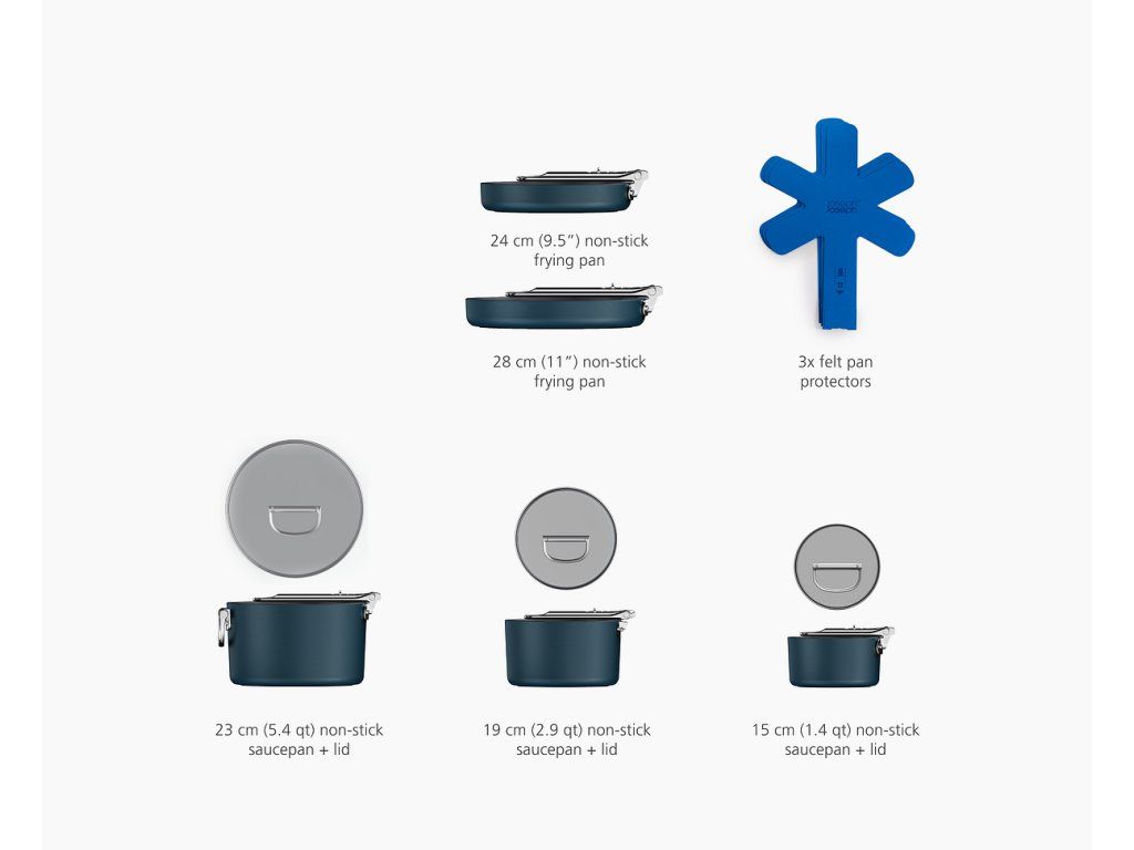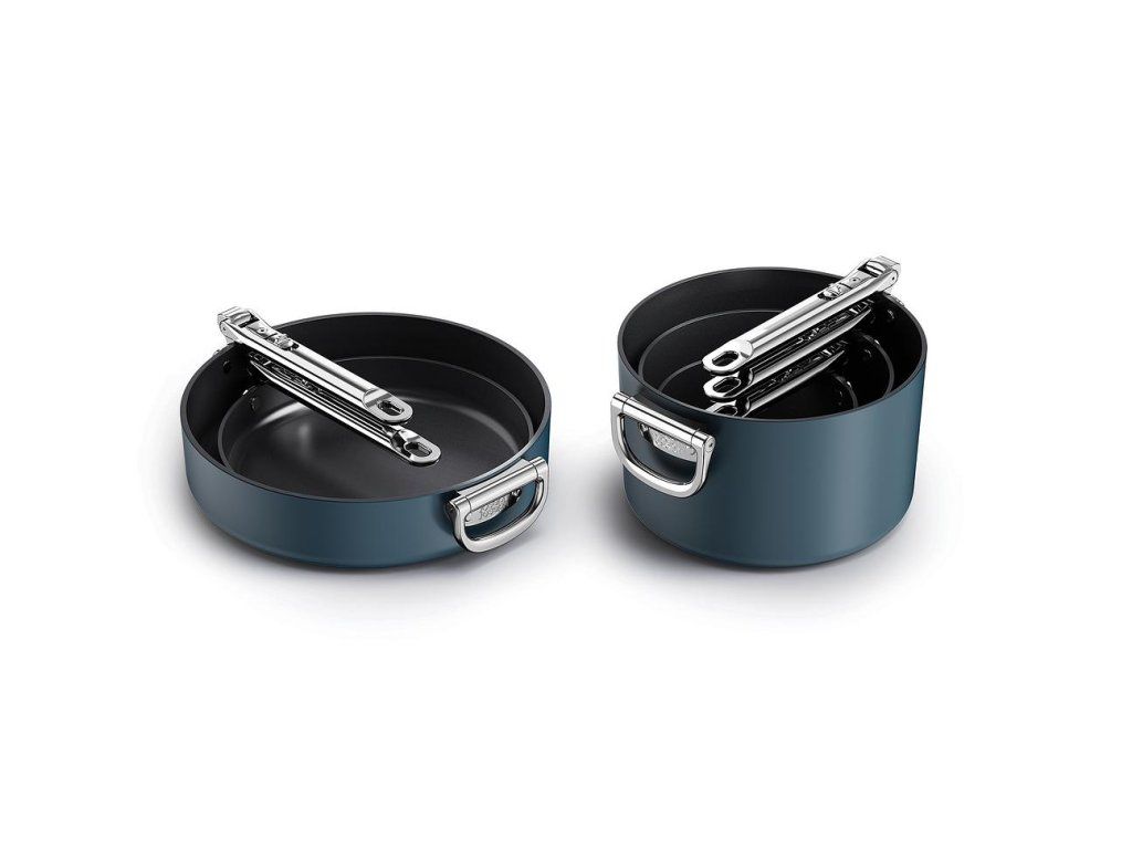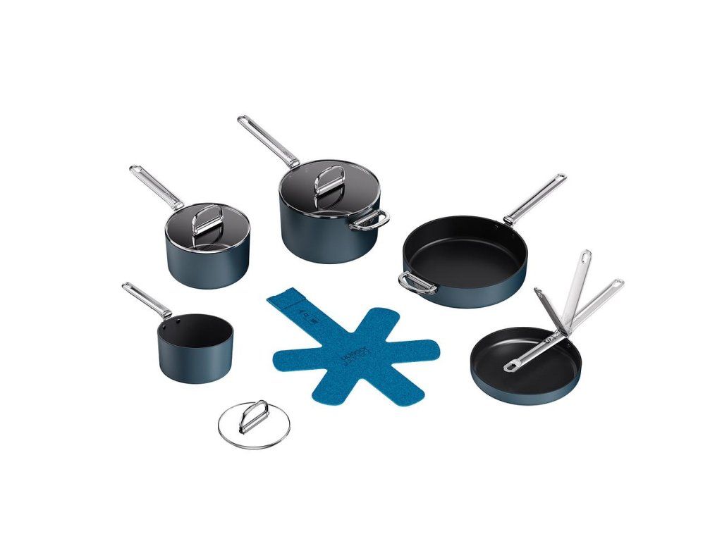 prémiová řada nádobí profesionální kvality a inovativního designu. Nejkompaktnější nádobí pro prostorově úsporné skladování. Barva Midnight Blue.