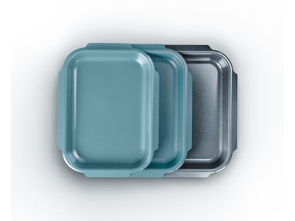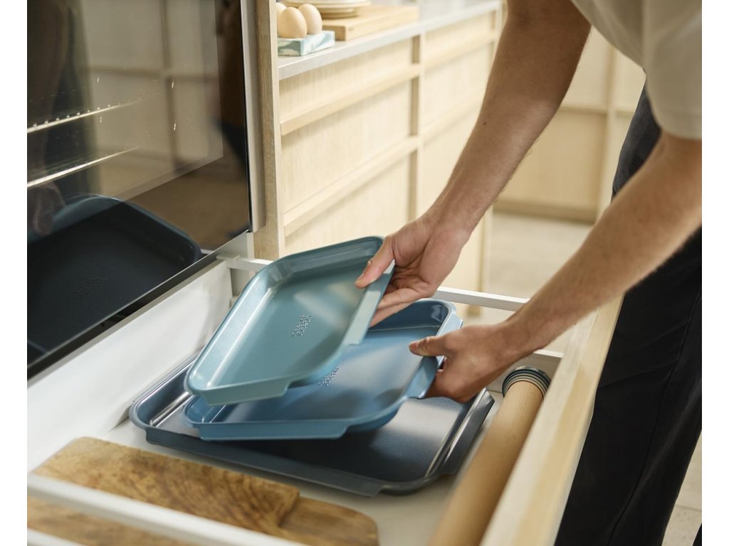 Stohovatelné pečící plechy JOSEPH JOSEP Nest™ Bake jsou ergonomicky tvarovány tak, aby postranní velké rukojeti umožňovali snadné uchopení s kuchyňskými rukavicemi nebo chňapkami. Plechy jsou vyrobeny z těžké uhlíkové oceli s odolným dvouvrstvým nepřilnavým povrchem bez obsahu PTFE, PFAS, PFOA, olova a kadmia. Lze je úhledně stohovat a skladovat. Mezery mezi plechy umožňují proudění vzduchu a jsou prevencí proti poškrábání nepřilnavých povrchů.