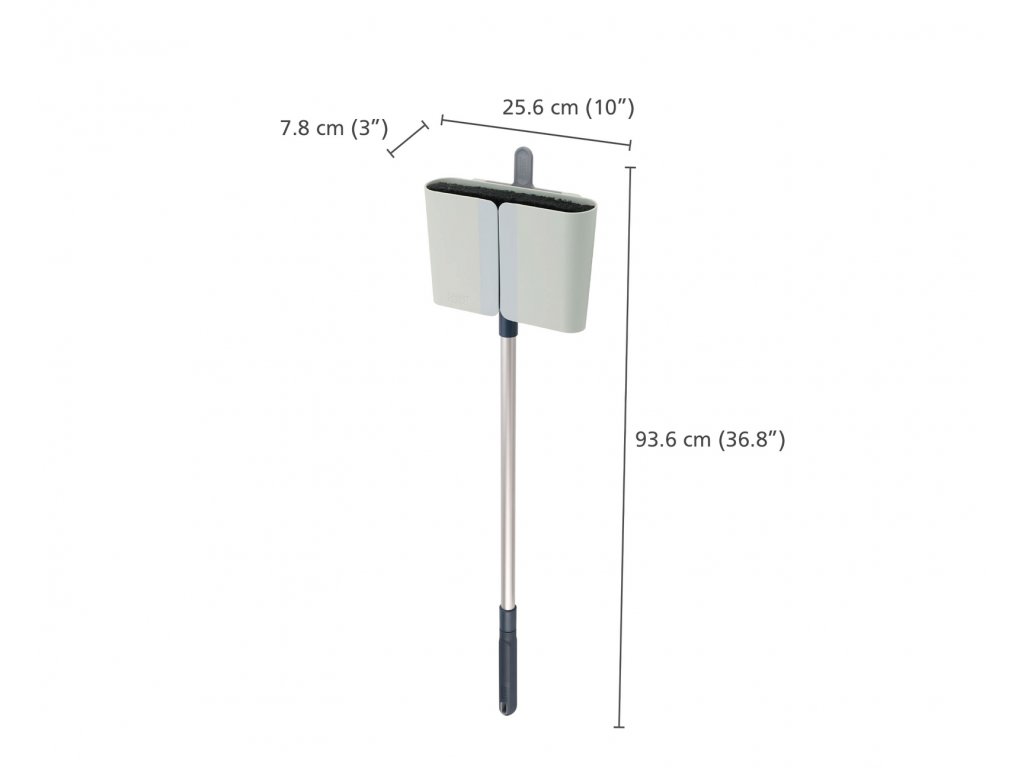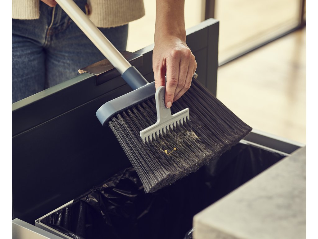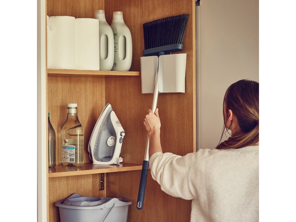 Smeták s nástěnným držákem, teleskopickou hliníkovou tyčí a čistícím hřebenem pro odstranění zachycených vlasů a nečistot – JOSEPH JOSEPH CleanStore 65002. Nástěnný držák smetáku tvoří samostatné odnímatelné pouzdro a vlastní napevno instalovaná nástěnná část. Pouzdro zakrývá štětiny smetáku a zlepšuje tak hygienu ve skladovacím prostoru. Vkládání smetáku do pouzdra je usnadněno měkkými pryžovými chlopněmi na jeho čelní straně. Pouzdro je odnímatelné a snadno čistitelné. Smeták má dlouhé měkké opeřené štětiny, které účinně smetou i jemný prach. Tyč smetáku je hliníková, teleskopicky nastavitelná s protiskluzovou rukojetí. Součástí nástěnného držáku je kapsa s hřebenem pro snadné vyčesávání nečistot ze štětin smetáku.