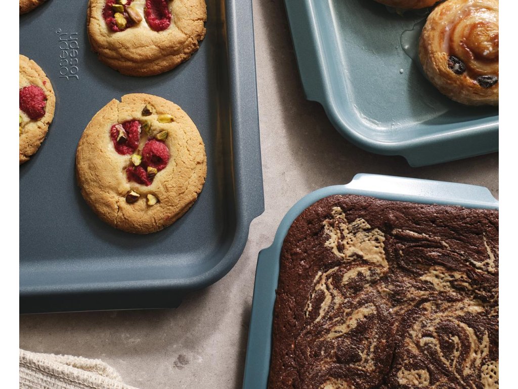 Stohovatelné pečící plechy JOSEPH JOSEP Nest™ Bake jsou ergonomicky tvarovány tak, aby postranní velké rukojeti umožňovali snadné uchopení s kuchyňskými rukavicemi nebo chňapkami. Plechy jsou vyrobeny z těžké uhlíkové oceli s odolným dvouvrstvým nepřilnavým povrchem bez obsahu PTFE, PFAS, PFOA, olova a kadmia. Lze je úhledně stohovat a skladovat. Mezery mezi plechy umožňují proudění vzduchu a jsou prevencí proti poškrábání nepřilnavých povrchů.