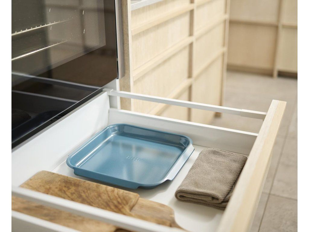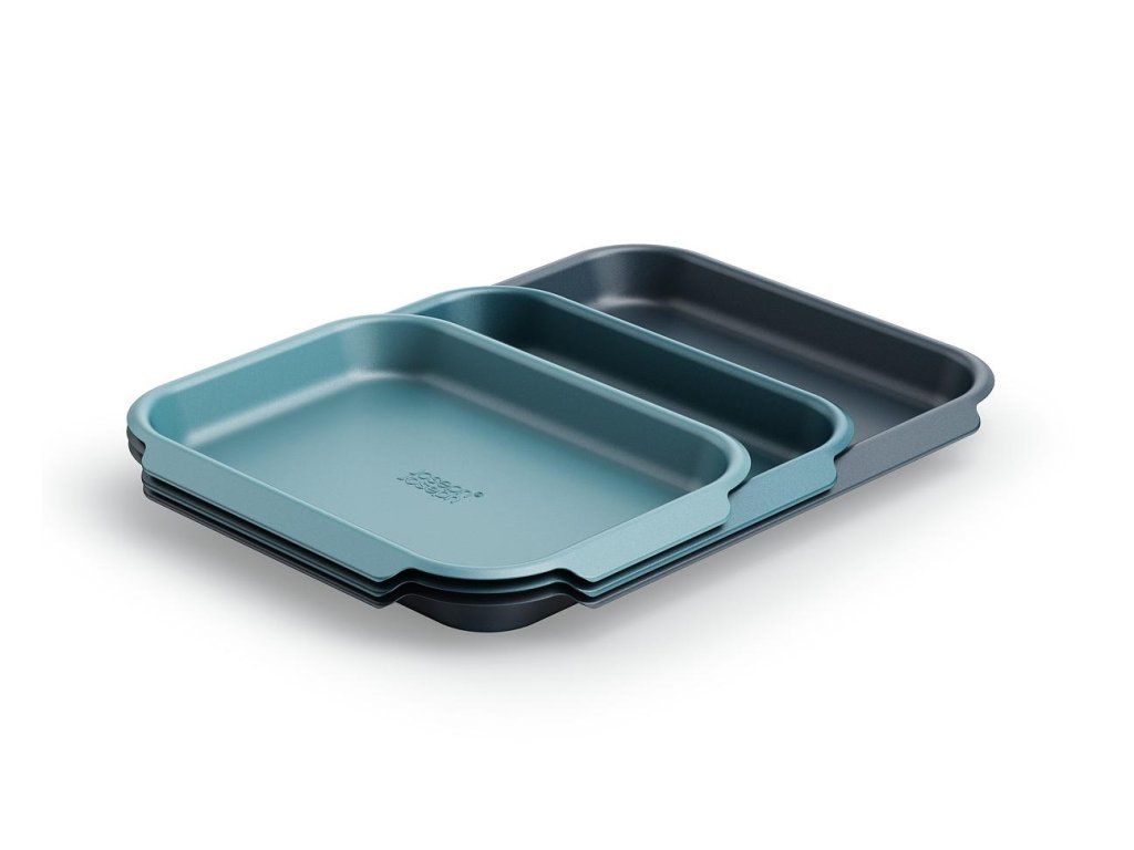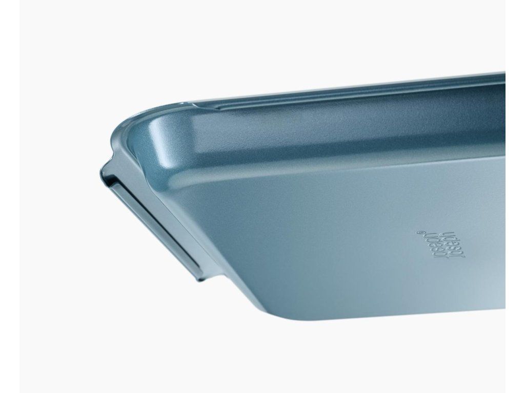 Stohovatelné pečící plechy JOSEPH JOSEP Nest™ Bake jsou ergonomicky tvarovány tak, aby postranní velké rukojeti umožňovali snadné uchopení s kuchyňskými rukavicemi nebo chňapkami. Plechy jsou vyrobeny z těžké uhlíkové oceli s odolným dvouvrstvým nepřilnavým povrchem bez obsahu PTFE, PFAS, PFOA, olova a kadmia. Lze je úhledně stohovat a skladovat. Mezery mezi plechy umožňují proudění vzduchu a jsou prevencí proti poškrábání nepřilnavých povrchů.