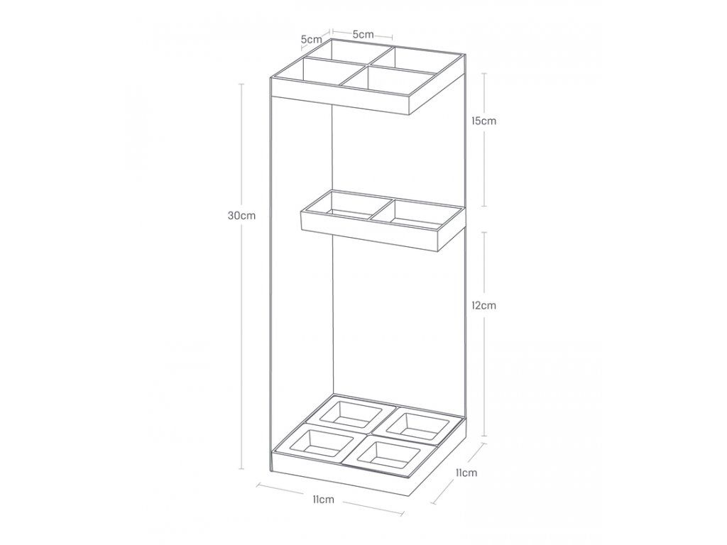 Kovový stojan na 4 deštníky - YAMAZAKI Smart 6719. Vyjmutelné plastové (ABS) odkapávací misky. Možnost zkrácení pro 2 krátké deštníky. Velikost: 30 x 11 x 11 cm (VxŠxH).