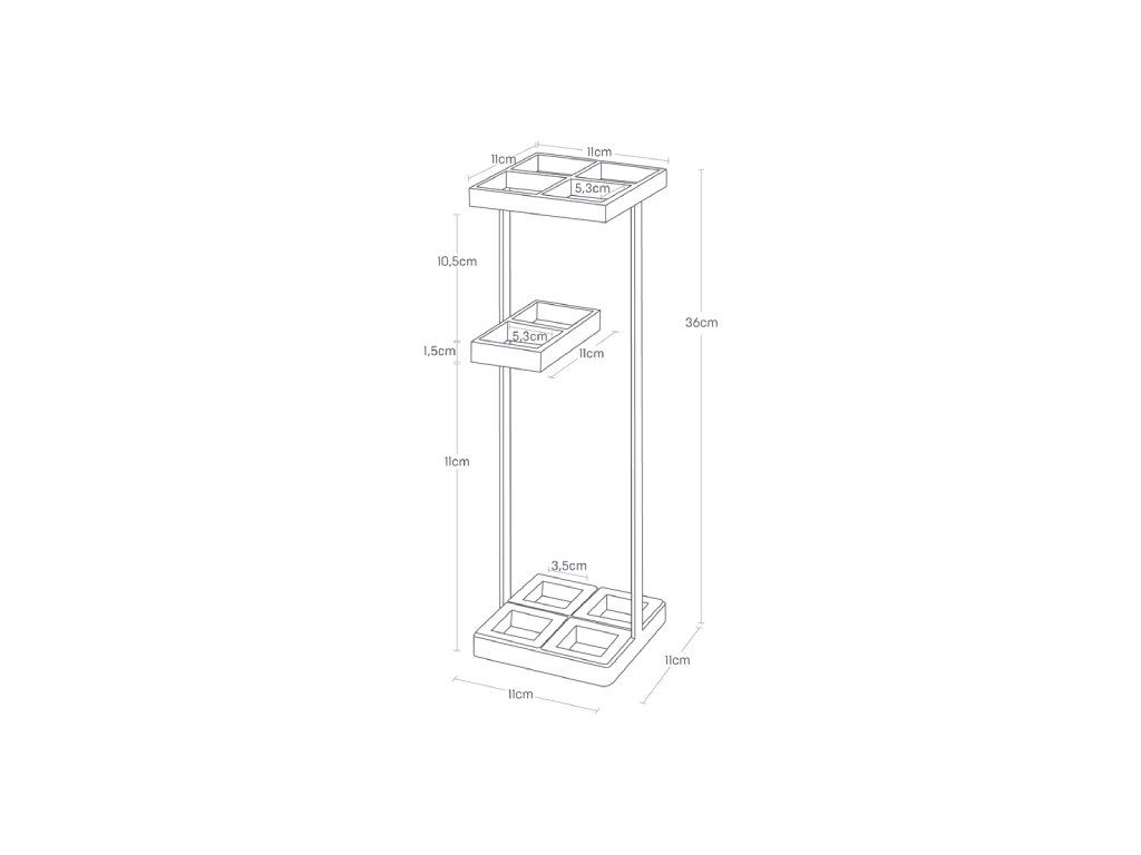Kovový stojan na 4 deštníky - YAMAZAKI Tower 7639. Vyjmutelné plastové (ABS) odkapávací misky. Možnost zkrácení pro 2 krátké deštníky. Velikost: 36 x 11 x 11 cm (VxŠxH).