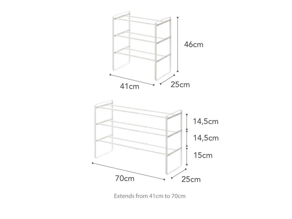 Kovový stojan na 9-16 párů bot - YAMAZAKI 7556. Nastavitelná šířka v rozsahu 41 - 70 cm. Stohovatelný - součástí balení jsou spojovací díly pro propojení s dalším stojanem. Velikost: 46 x 41-70 x 25 cm (VxŠxH).