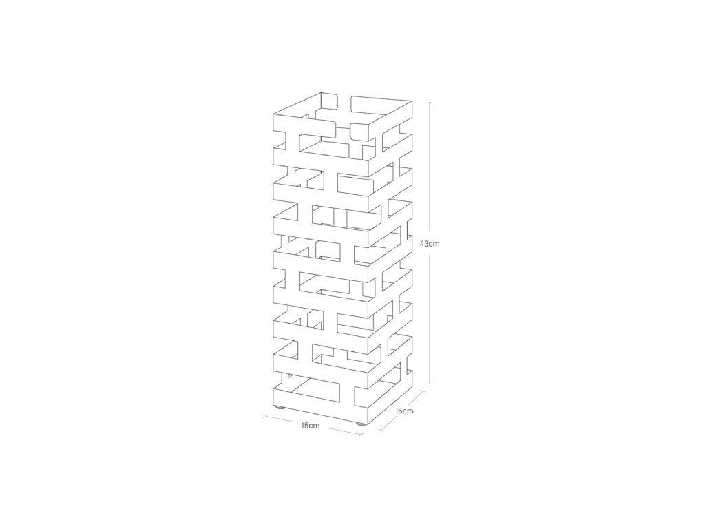 Kovový stojan na deštníky YAMAZAKI Brick 2362. Složené krátké deštníky k zavěšení vně boční konstrukce. Vnitřní odnímatelná silikonová podložka. Velikost: 43 x 15 x 15 cm (VxŠxH).