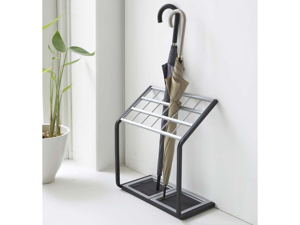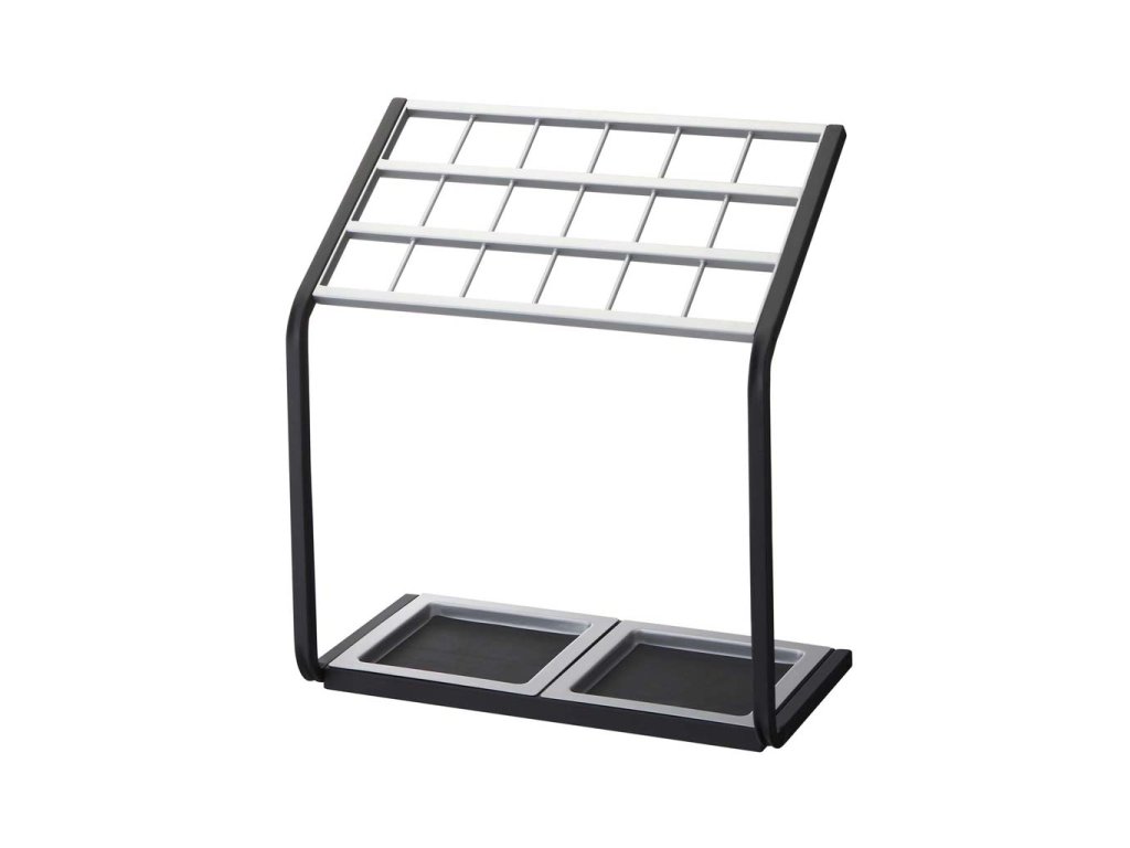 Stojan na deštníky s velkou kapacitou - YAMAZAKI X-Change 6295. Pro každý deštník oddělené místo. Vyroben z lakovaného kovu a plastu. Velikost: 50 x 45 x 24 cm (VxŠxH).