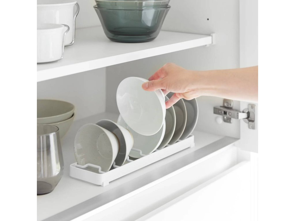 Kovový kompaktní stojan pro bezpečné uložení misek - YAMAZAKI Tower 1371 (bílý) / 1372 (černý). Pojme až 7 misek v závislosti na jejich velikosti a tvaru. Je vybaven silikonovými nožičkami pro větší stabilitu. Ideální k využití na pracovní desce, policích a v zásuvkách. K dispozici ve dvou velikostech: S a L.