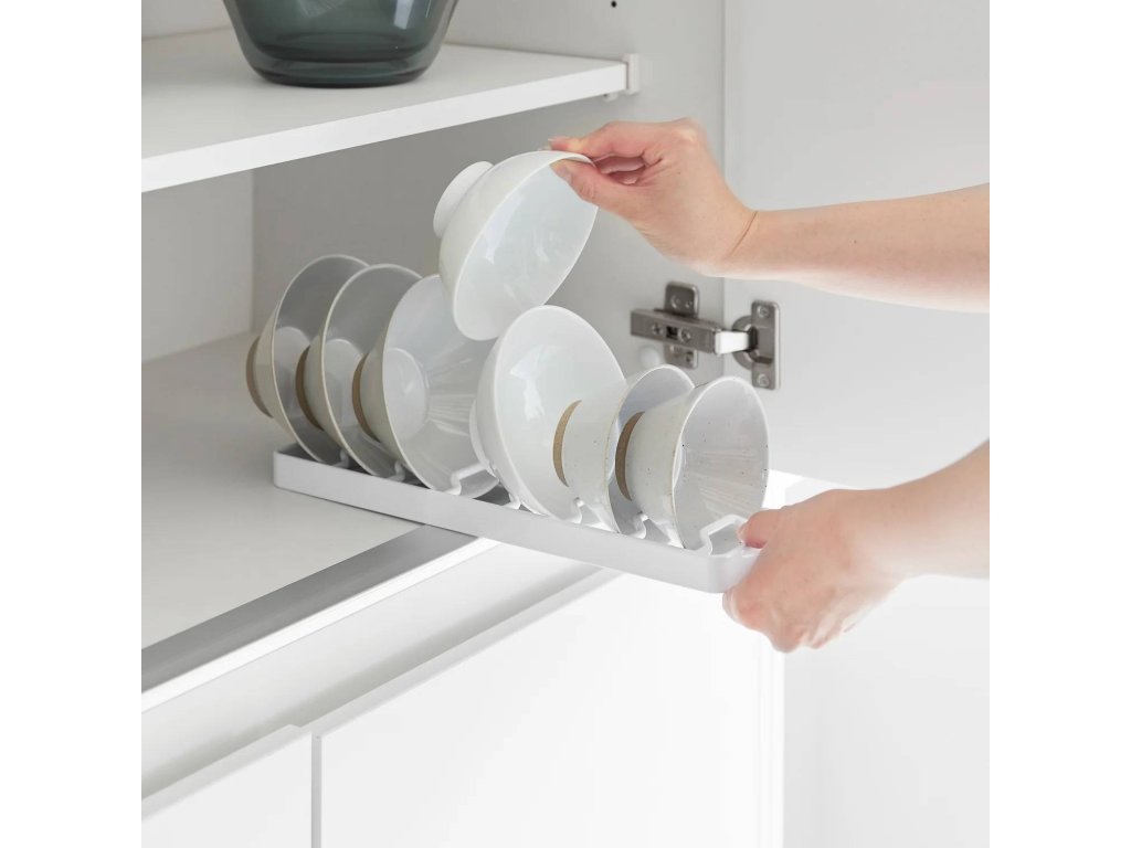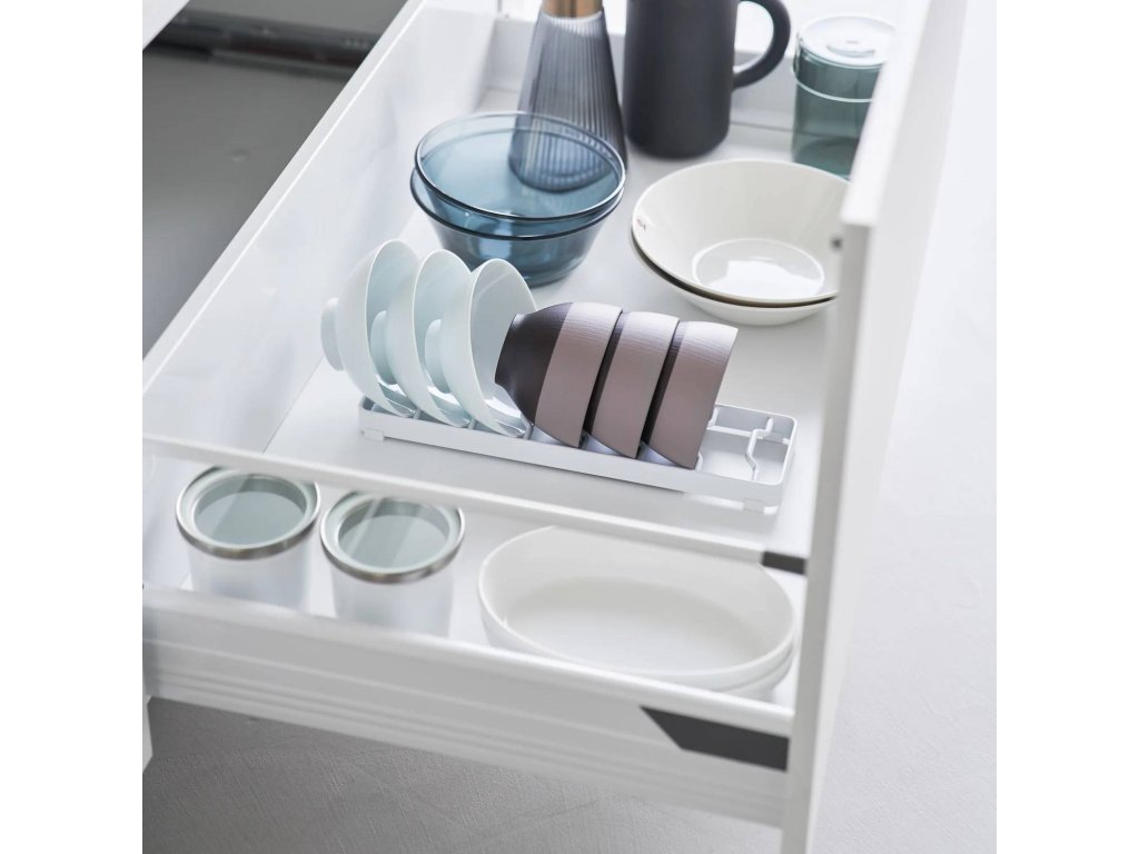 Kovový kompaktní stojan pro bezpečné uložení misek - YAMAZAKI Tower 1371 (bílý) / 1372 (černý). Pojme až 7 misek v závislosti na jejich velikosti a tvaru. Je vybaven silikonovými nožičkami pro větší stabilitu. Ideální k využití na pracovní desce, policích a v zásuvkách. K dispozici ve dvou velikostech: S a L.
