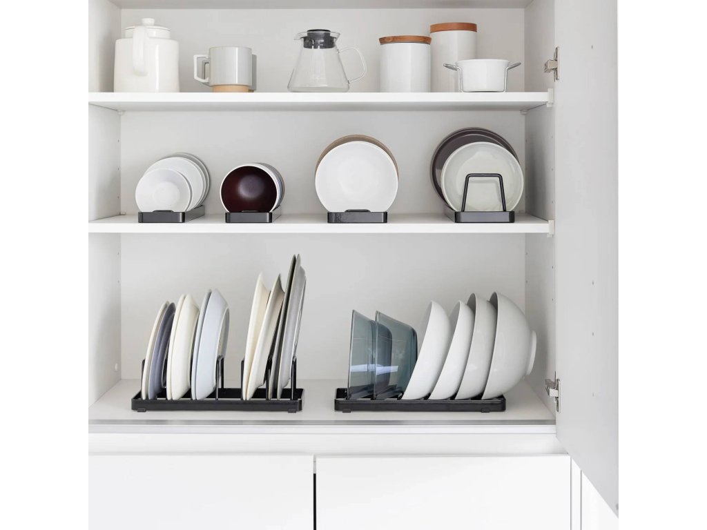 Kovový kompaktní stojan pro bezpečné uložení misek - YAMAZAKI Tower 1371 (bílý) / 1372 (černý). Pojme až 7 misek v závislosti na jejich velikosti a tvaru. Je vybaven silikonovými nožičkami pro větší stabilitu. Ideální k využití na pracovní desce, policích a v zásuvkách. K dispozici ve dvou velikostech: S a L.
