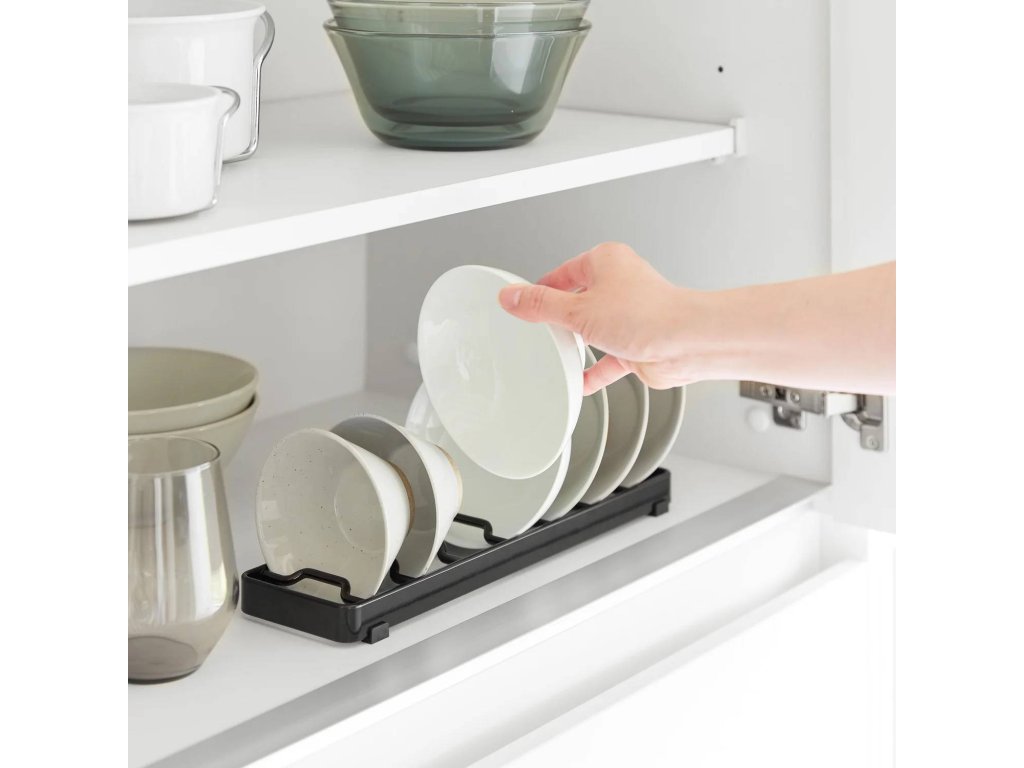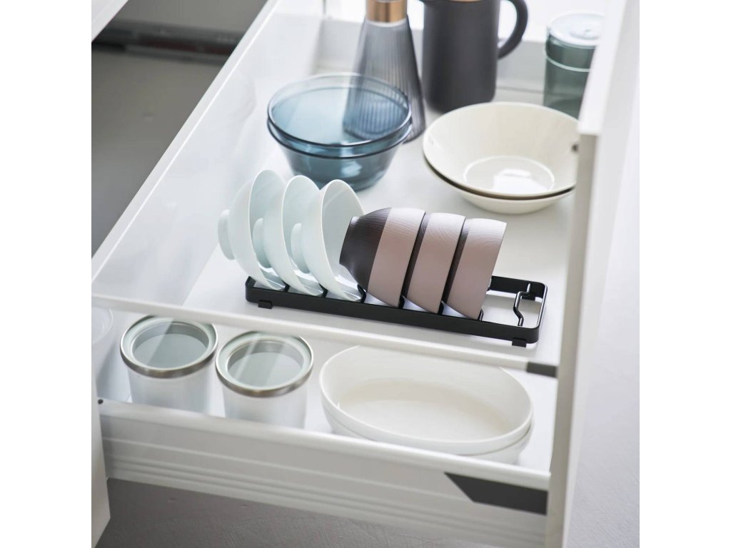 Kovový kompaktní stojan pro bezpečné uložení misek - YAMAZAKI Tower 1371 (bílý) / 1372 (černý). Pojme až 7 misek v závislosti na jejich velikosti a tvaru. Je vybaven silikonovými nožičkami pro větší stabilitu. Ideální k využití na pracovní desce, policích a v zásuvkách. K dispozici ve dvou velikostech: S a L.