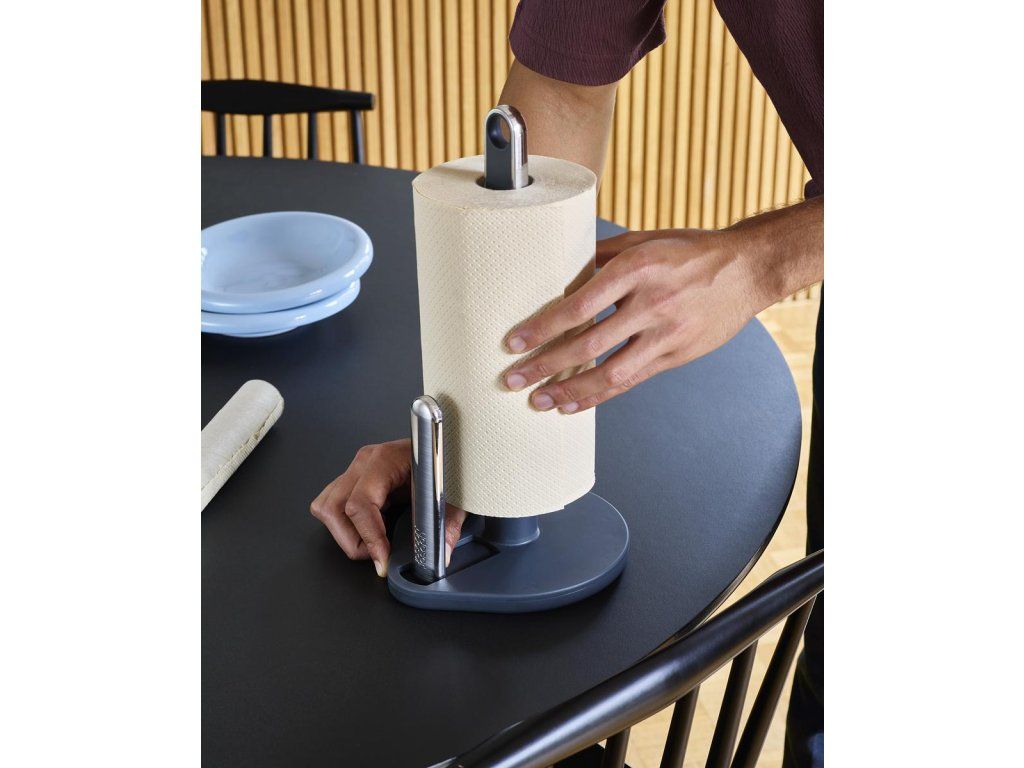 Prémiový stojan na role kuchyňských utěrek JOSEPH JOSEPH Hold 8500003 má závažím zatíženou stabilní základnu, pružinové napínací rameno zabraňující rozmotávání role a umožňující použití jednou rukou a praktické poutko pro jednoduché přenášení.
