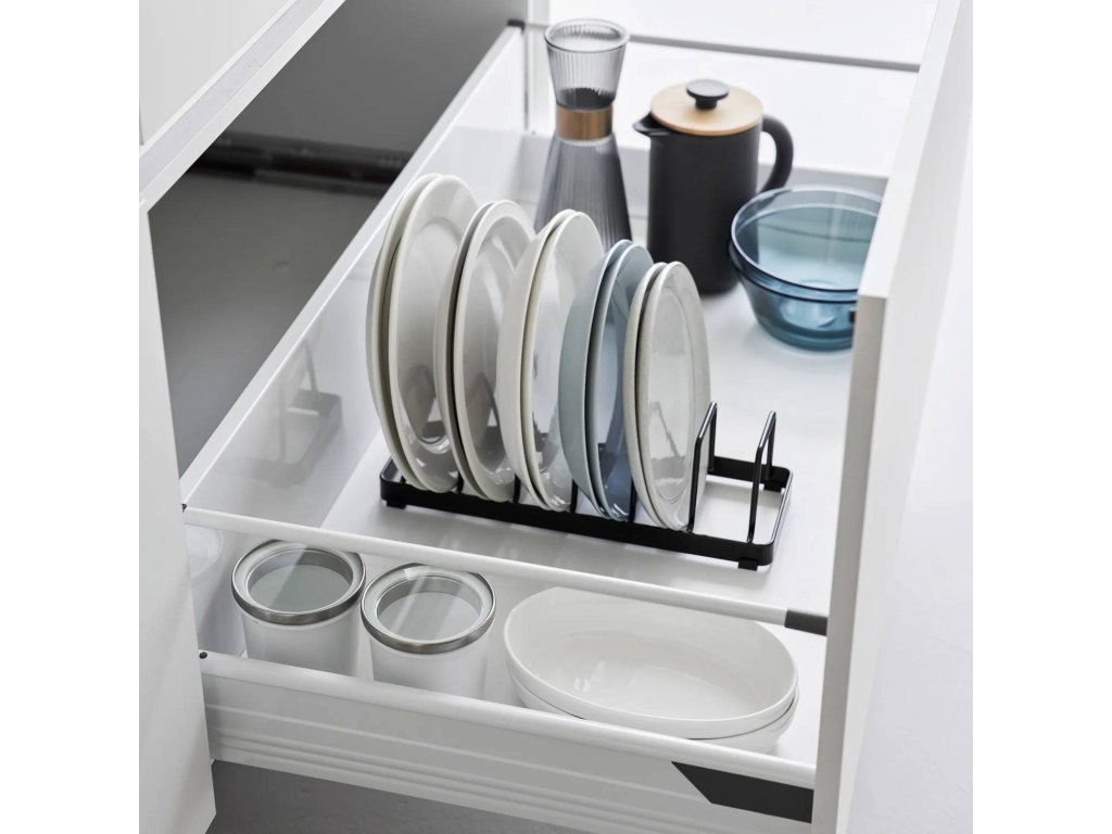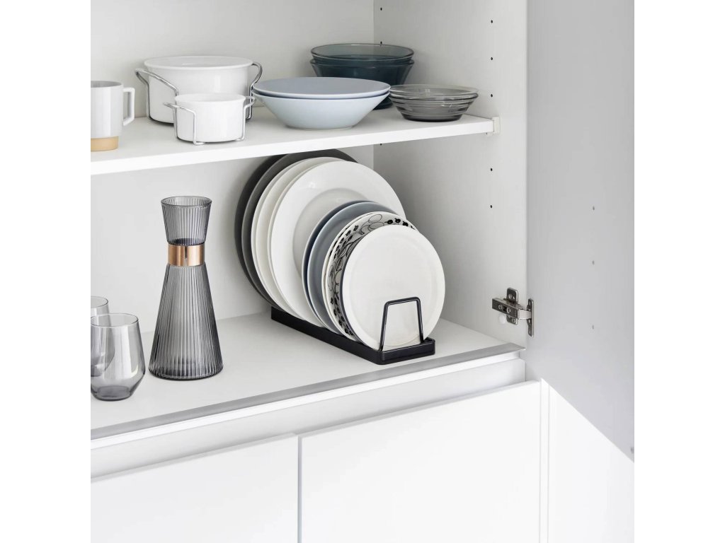 Kovový kompaktní stojan pro bezpečné uložení a snadný přístup k talířům – YAMAZAKI Tower 1375 (bílý) / 1376 (černý). Svislé řešení pro ukládání talířů odstraňuje riziko poškrábání způsobené jejich stohováním. Usnadňuje přístup a vede k efektivnímu využití prostoru skříňky. Stojan je kompatibilní s talíři o velikost 18-30 cm a výšce až 4 cm. Čtyři ochranné nožky chrání povrch a zajišťují lepší stabilitu. Pouze ruční mytí.