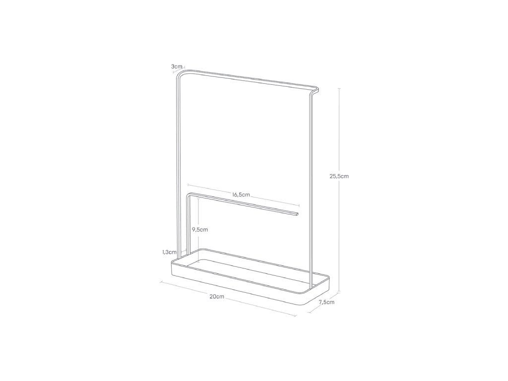 Multifunkční kovový stojánek YAMAZAKI Tower 6987 se dvěma konzolkami - k opření telefonu, k zavěšení hodinek, k odložení šperků. Horní konzolka vhodná k zavěšení brýlí. Velikost: 25,5 x 20 x 7,5 cm (VxŠxH).