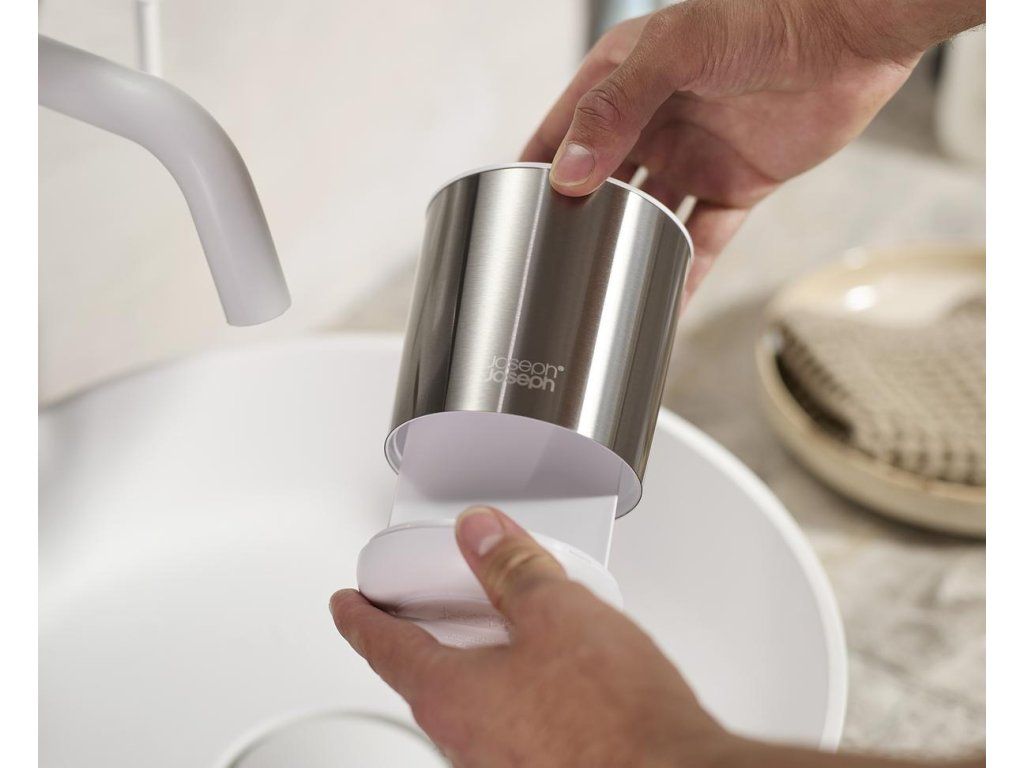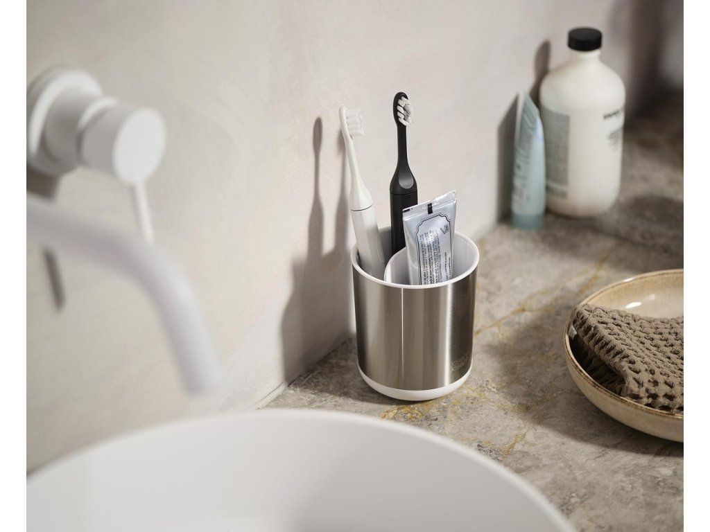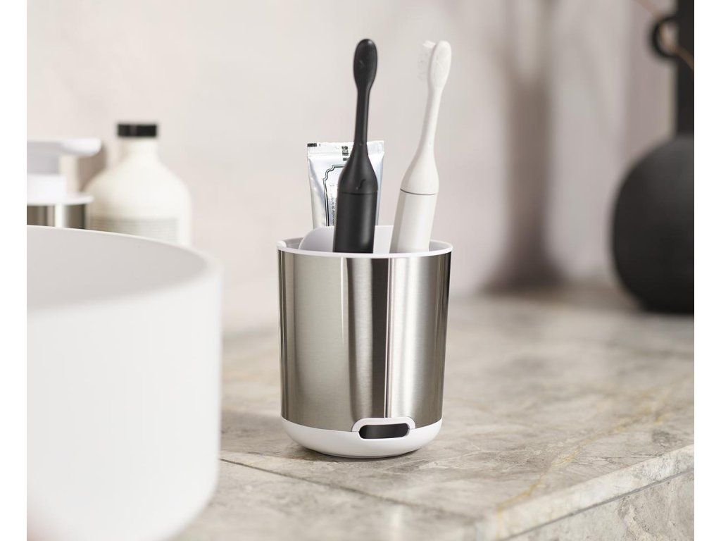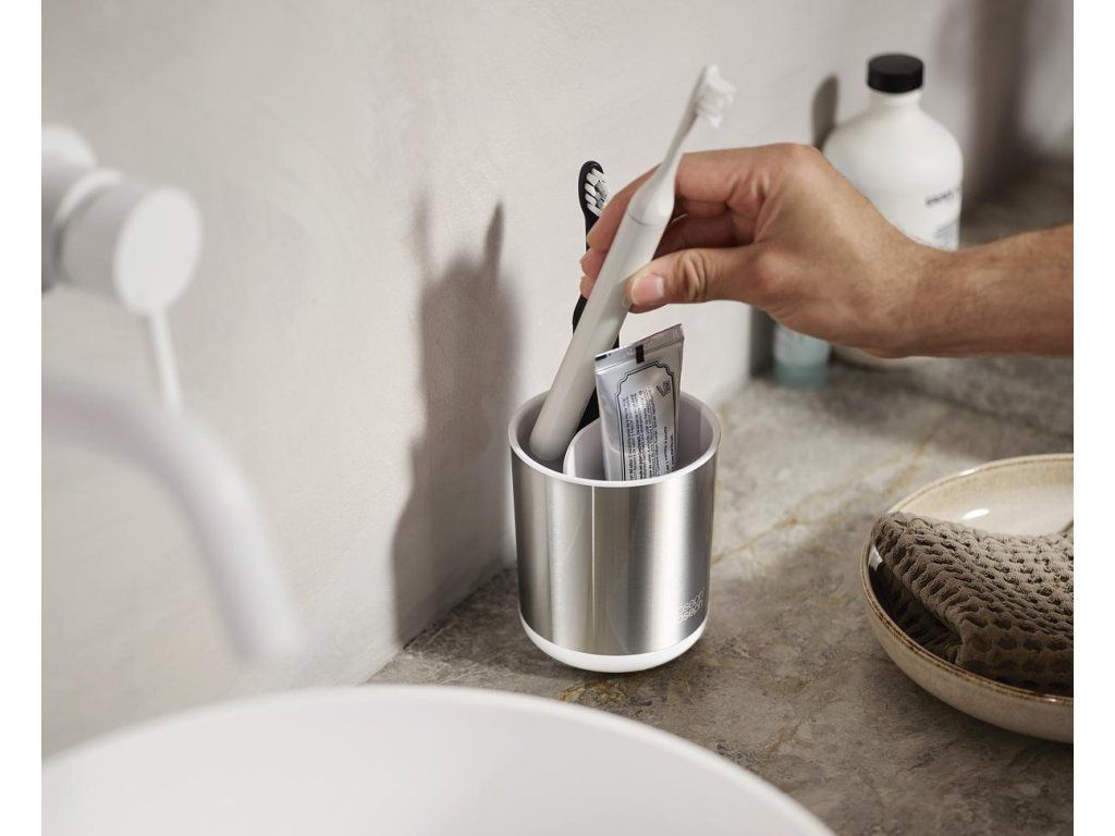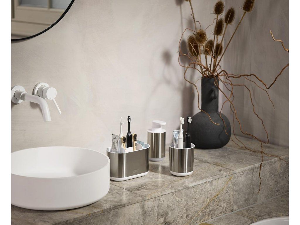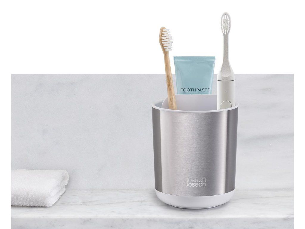 Stojánek na kartáčky JOSEPH JOSEPH Duo 70606 je rozdělený do 2 sekcí poskytujících prostor pro běžné kartáčky, elektrické kartáčky a pastu. Stojánek je snadno rozebratelný a čistitelný, s odvětrávacími otvory pro rychlé vysychání a protiskluznou základnou. Nerezový povrch s tzv. fingerprint-proof úpravou je odolný proti zanechávání otisků prstů.