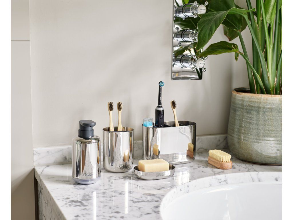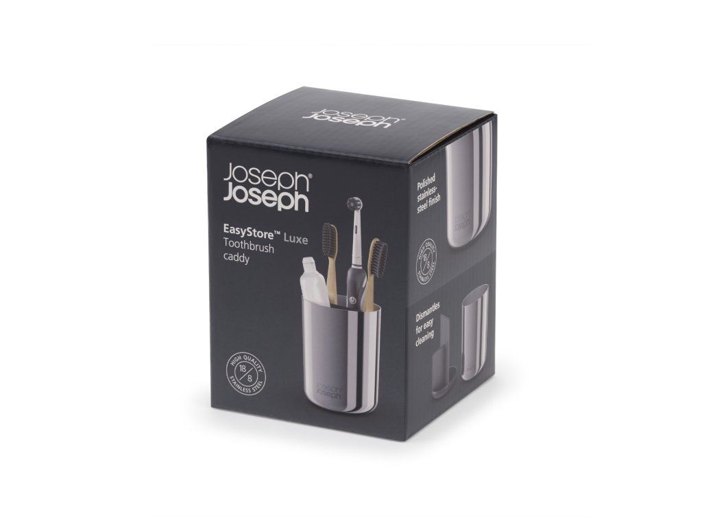 Stojánek na kartáčky JOSEPH JOSEPH EasyStore Luxe 70580 z leštěné nerezové oceli. Rozdělený do 3 sekcí poskytujících prostor pro běžné kartáčky/elektrické kartáčky/pastu. Snadno rozebratelný a čistitelný – odnímatelná plastová vnitřní vložka. Otírejte dočista vlhkým hadříkem a následně osušte měkkým suchým hadříkem. Neužívejte abrazivní čistící prostředky. Velikost: 11,7 x 9 x 9 cm (VxŠxH).