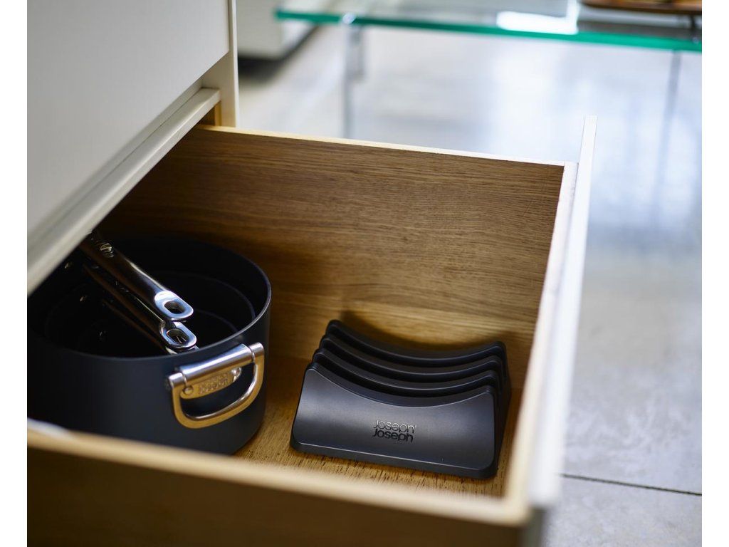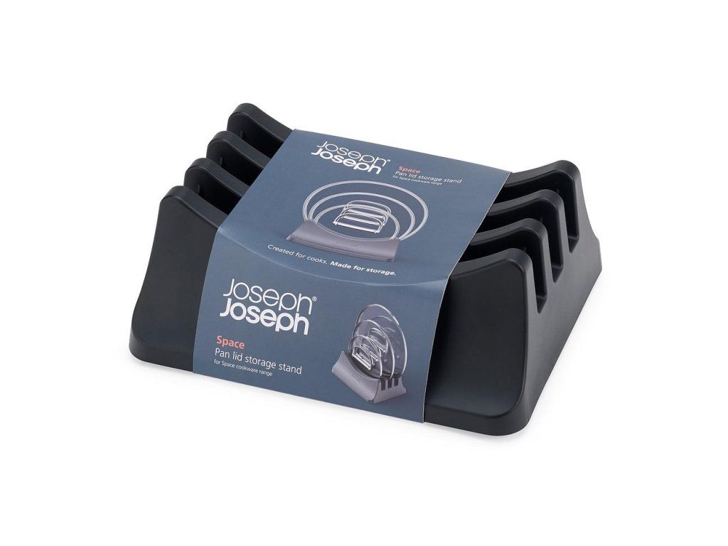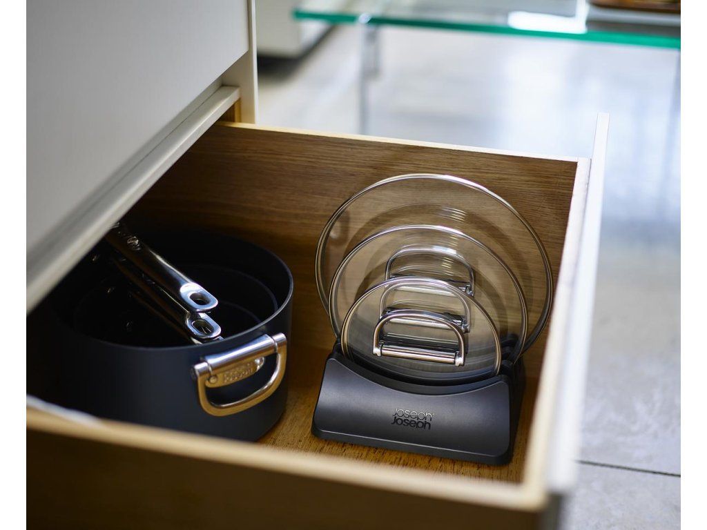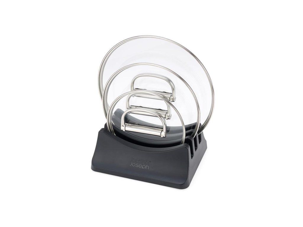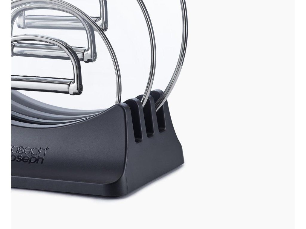 Stojánek na pokličky kolekce JOSEPH JOSEPH Space. Robustní stojánek pojme až tři pokličky různých velikostí. Protiskluzové nožky. Vhodný do zásuvek i skříněk. Otírejte vlhkým hadříkem.