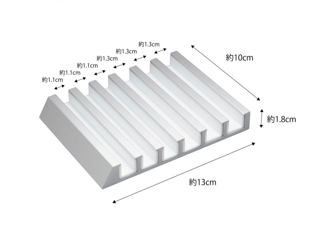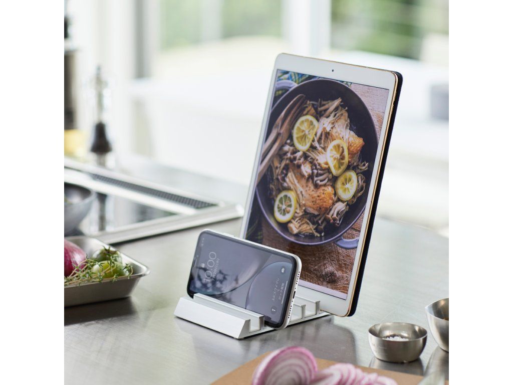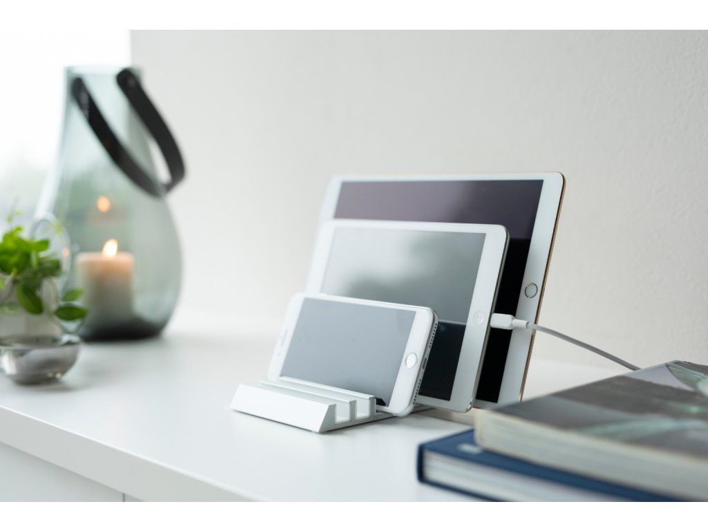 Hliníkový stojánek na telefony / tablety - YAMAZAKI Tower 5274. Silikonové kontaktní plochy. Určeno na 6 mobilů / tabletů - první 3 řady na přístroje tloušťky do 1,1 cm, zadní 3 řady na přístroje tlouštky do 1,3 cm. Velikost: 1,8 x 10 x 13 cm (VxŠxH).