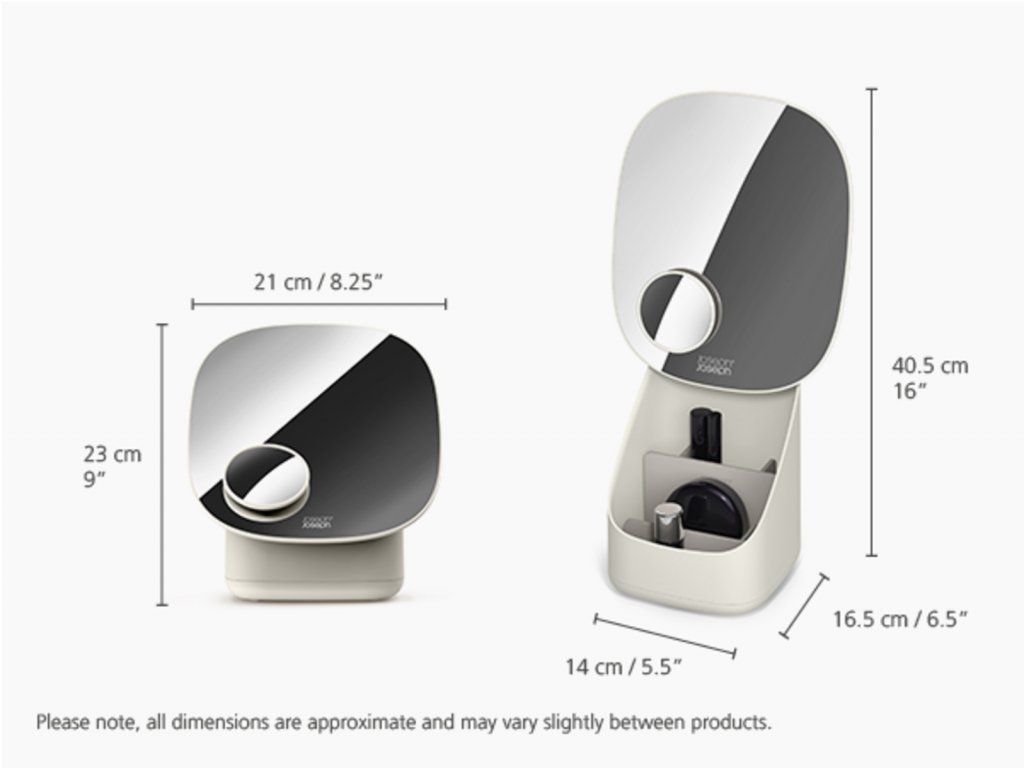 Stolní kosmetické zrcátko s úložným prostorem na kosmetiku - JOSEPH JOSEPH Viva 75001. Velké oválné zrcátko zakrývá jako víčko praktický úložný prostor na kosmetiku. Zrcátko je s úložným korpusem spojeno kloubem umožňujícím po odklopení přístup ke kosmetice a zároveň snadné nastavení optimálního úhlu. Hlavní velké oválné zrcátko je doplněno malým kompaktním magnetickým zvětšovacím zrcátkem (3x) pro zobrazení detailů. Malé zrcátko je možné držet v ruce nebo magneticky uchytit na plochu velkého zrcátka (zadní strana upravena pro bezpečné uchycení bez rizika poškrábání). Úložný prostor na kosmetiku je vybaven vnitřní odnímatelnou přepážkou pro snadné čištění. Protiskluzová základna.