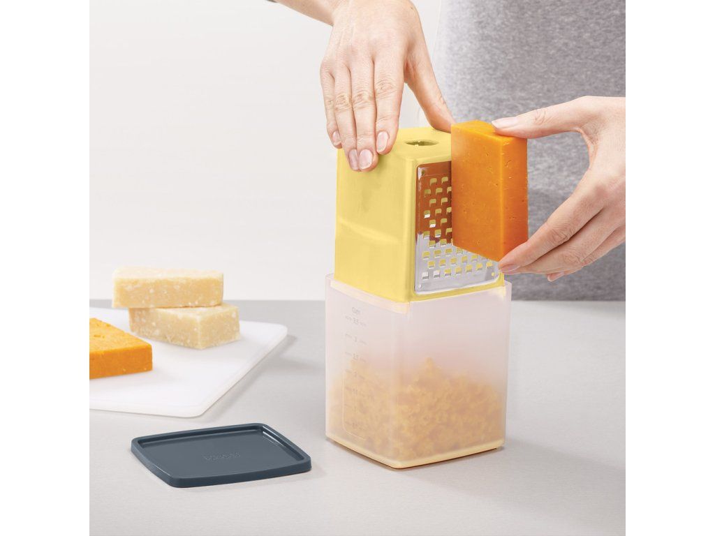 Struhadlo na sýr se zásobníkem nastrouhaného sýra. Materiál: polypropylen vyztužený skelným vláknem, polypropylen, ABS, nerez (301). Velikost: 12 x 11 x 10 cm (VxŠxH).
